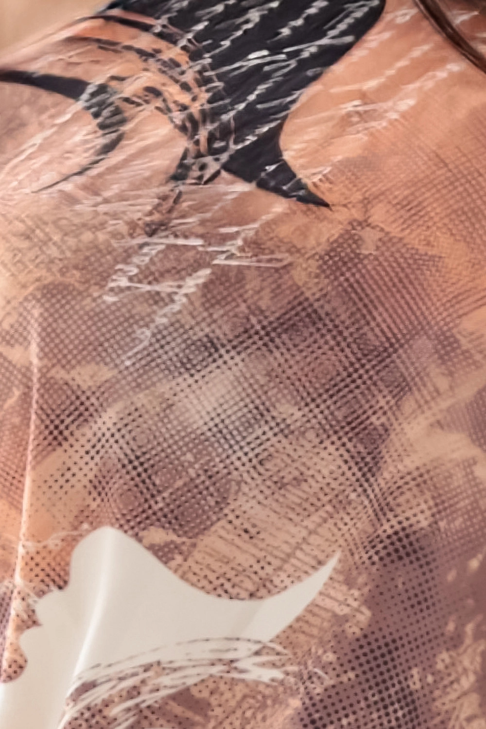 Vzor v odstínech měděné, béžové a černé barvy dodává stylizaci jedinečný charakter. Lodičkový výstřih lze nosit i smyslně spuštěný přes jedno rameno. Model má 3/4 rukávy a praktické kapsy. Ideální na každodenní schůzky i večerní vycházky.