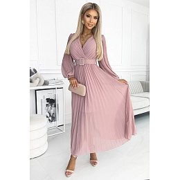 Klara - plisované šifonové šaty s výstřihem, dlouhým rukávem a páskem. plisování na výstřihu a rukávech dodává šatům eleganci. barva: pudrově růžová. značka numoco.