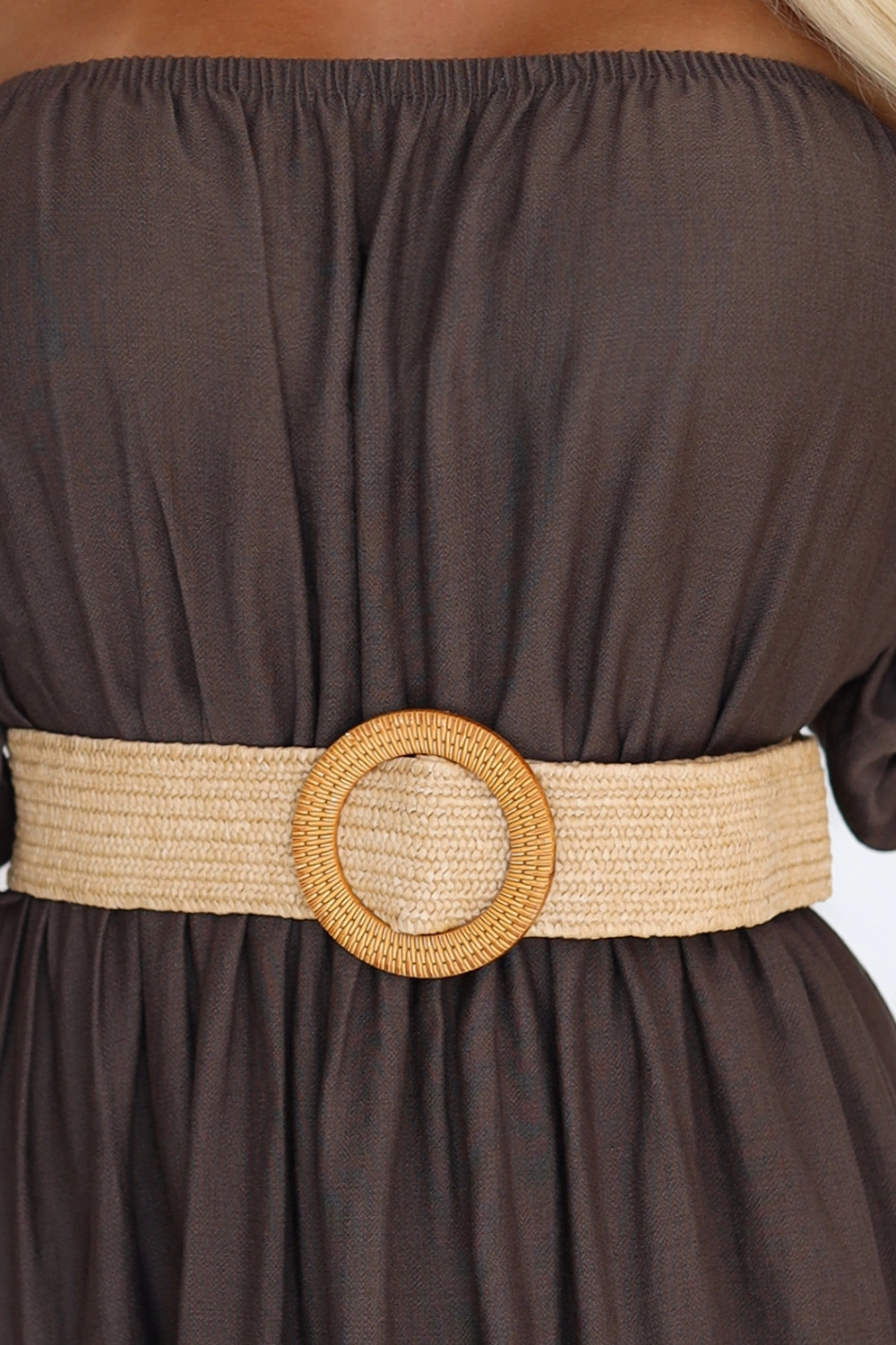 Stylové a pohodlné maxi šaty v boho stylu jsou ideální volbou pro letní dny, procházky a prázdninové výlety. Model s odhalenými rameny a krátkými, vyleštěnými rukávy decentně zdůrazňuje ženské přednosti, zatímco elastický horní díl zajišťuje pohodlné nošení. Celek doplňuje pletený pásek s ozdobnou sponou, který krásně zvýrazní pas.