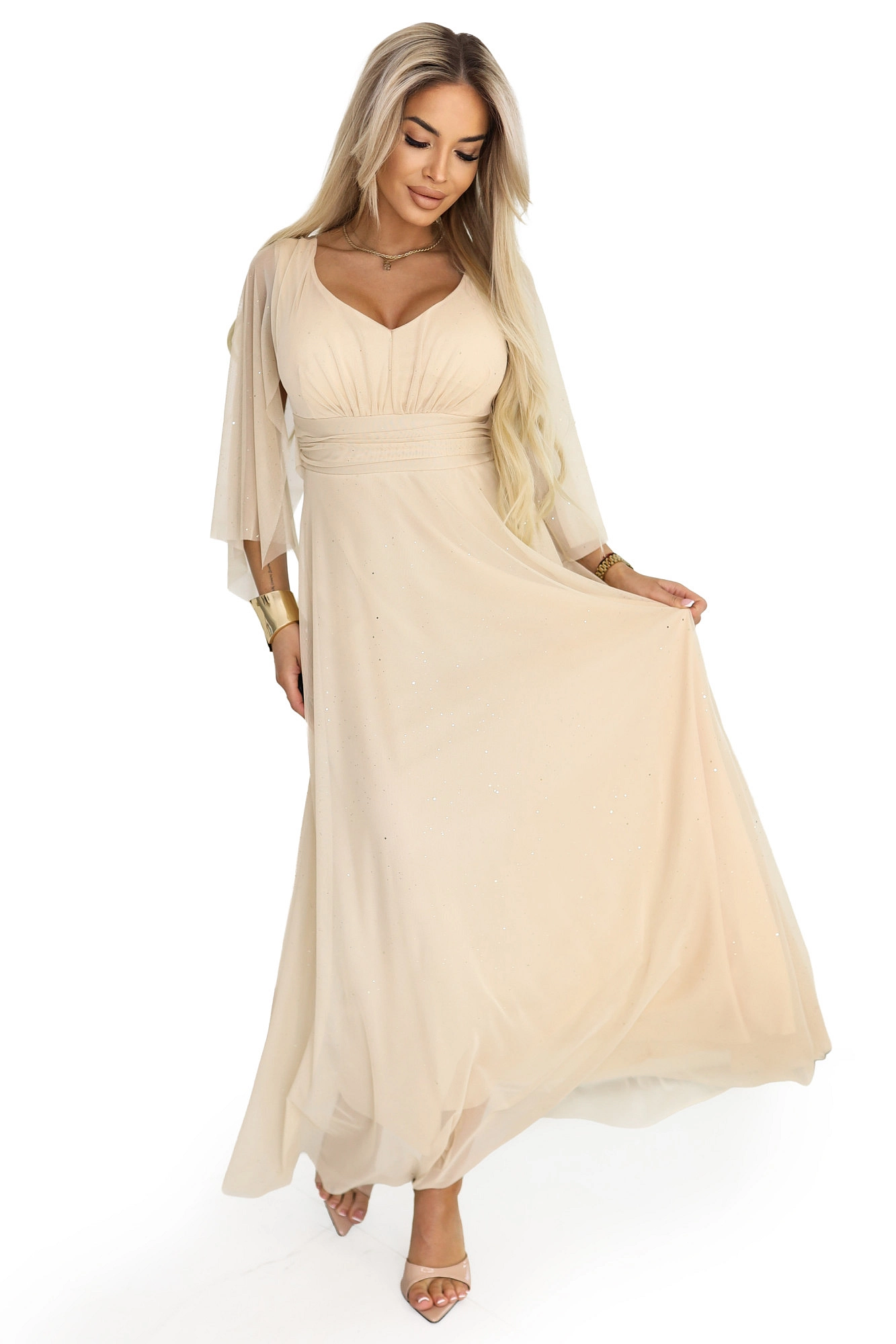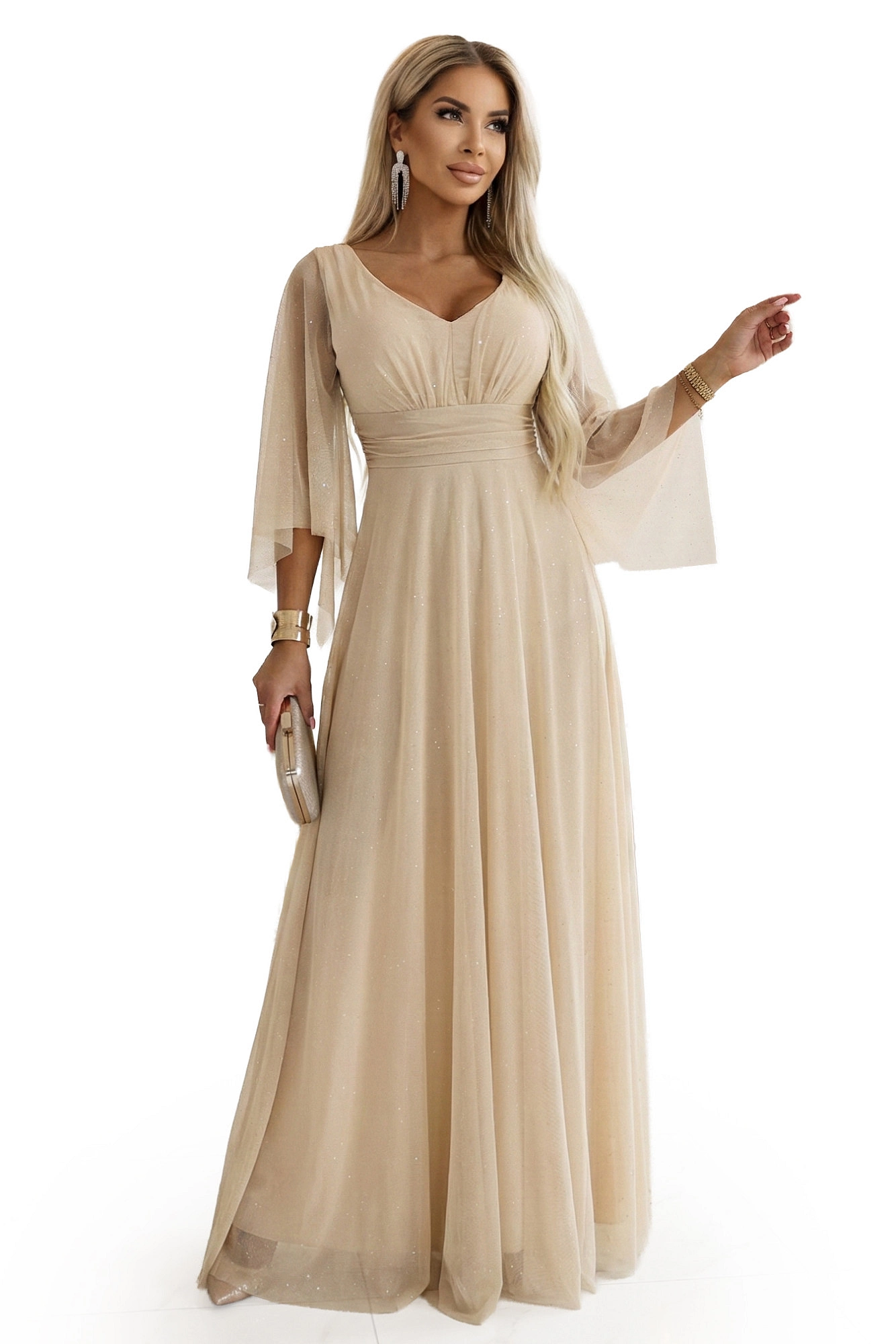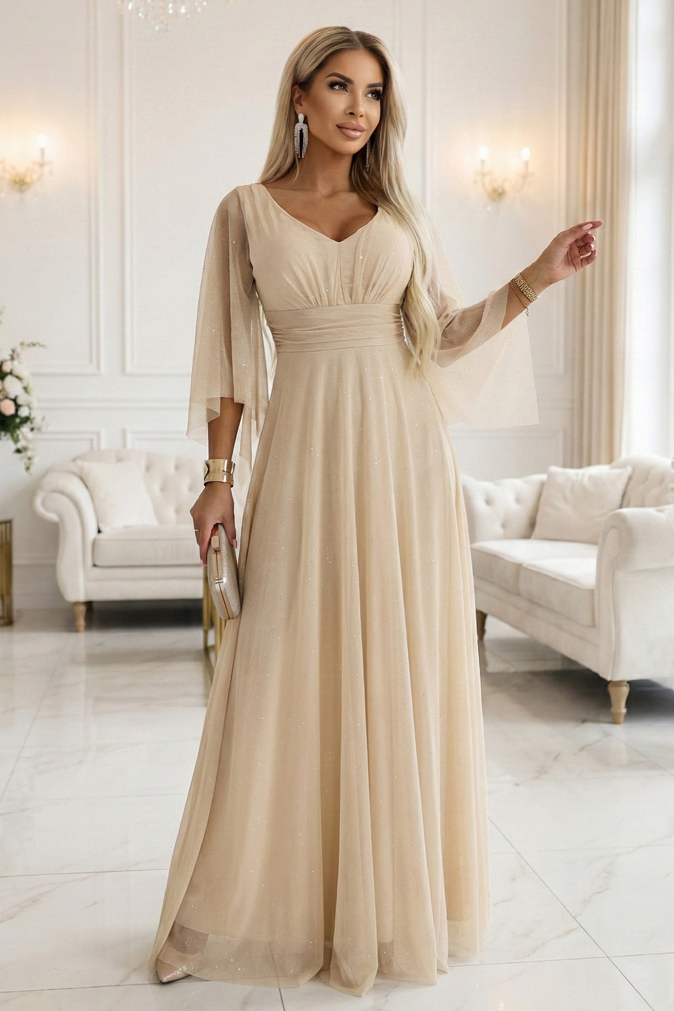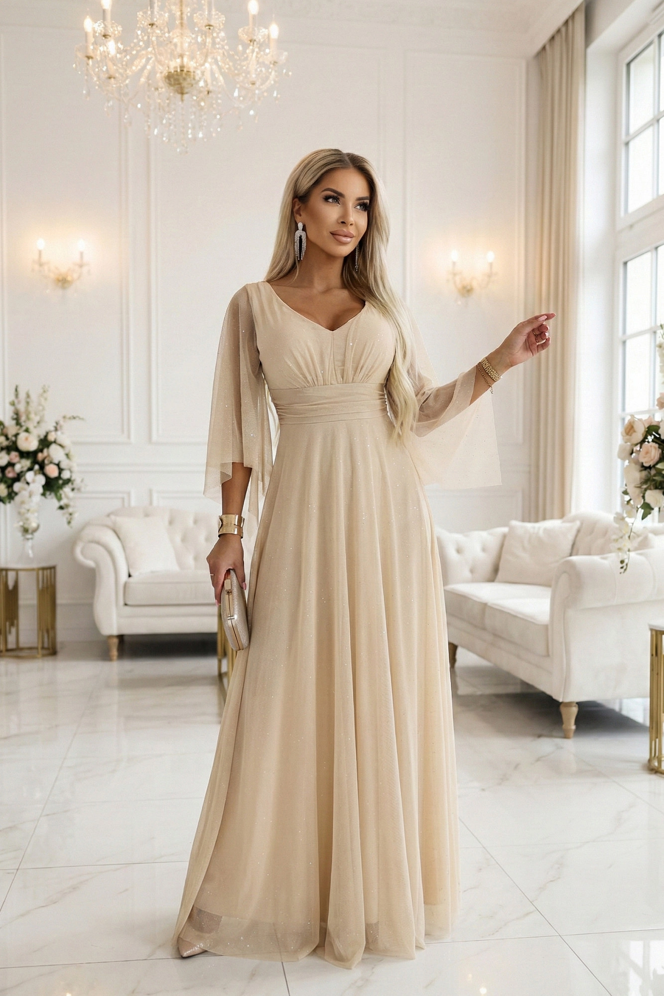 Horní díl s elegantním výstřihem do V krásně odhaluje dekolt a klíční kosti, zatímco jemné řasení dodává lehkost a noblesu. Pas je výrazně zvýrazněn, což dodává siluetě harmonické proporce. Dlouhý splývavý lem je volně splývavý, opticky zeštíhluje a je pohodlný i ve větších velikostech, proto tento model dobře funguje i jako plus size šaty. Splývavé poloprůhledné rukávy dodávají celkovému vzhledu éterický vzhled a v pohybu působí nádherně.