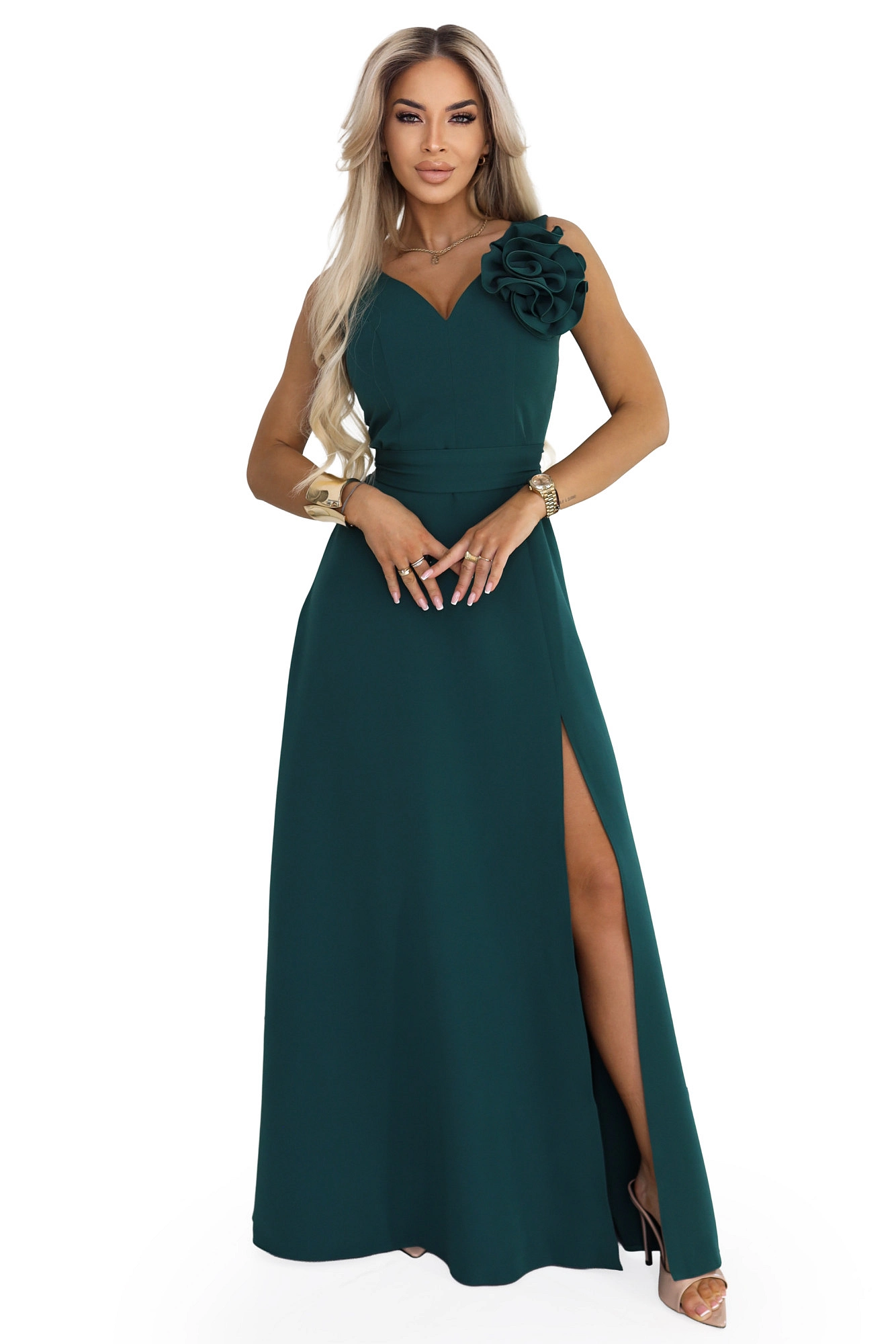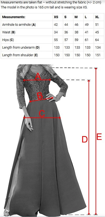Model má výstřih ve tvaru srdce a široká ramínka a ozdobná květina na rameni upoutá pozornost. Pas je zvýrazněn postavu obepínajícím páskem, který se vzadu zavazuje mašlí. Spodní část je dlouhá a mírně rozšířená a rozparek na nohavicích usnadňuje pohyb a dodává lehkost, zatímco vzadu je vidět decentní průstřih ve tvaru písmene "V".