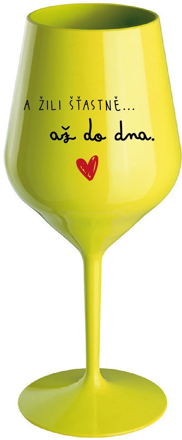 Nerozbitná žlutá vinná sklenice s motivem A ŽILI ŠŤASTNĚ AŽ DO DNA je skvělá na zahradu, pláž, výlet, piknik a parádu udělá i při kempování. Jelikož je vyrobená z kvalitního polykarbonátu je de facto nerozbitná. Je to luxusní kousek, s nímž si víno můžete vychutnat prostě kdekoliv. Mají ergonomický tvar, který příjemně padne do ruky a protože je lehká, usnadňuje to její přenášení. Je snadno skladovatelná a lehce se čistí. Díky svému designu si s ní můžete vychutnat doopravdy kdekoliv bezproblémové pití výborného vína. Materiál PP. Vyrobené s láskou v ČR