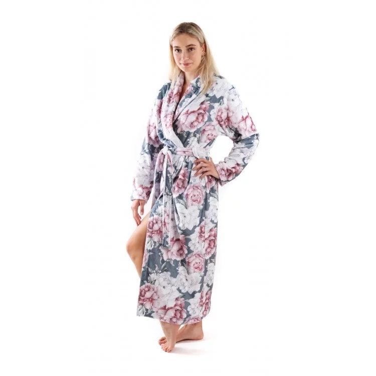 Aisha, dámský hřejivý župan s motivem pivoněk na šedém podkladu délka: 125cm S, 130cm M, 135cm L, 140cm XL, 145cm XXL střih:  župan s límcem, kapsy v bočním švu , pásek velikosti:  S,M,L,XL,XXL