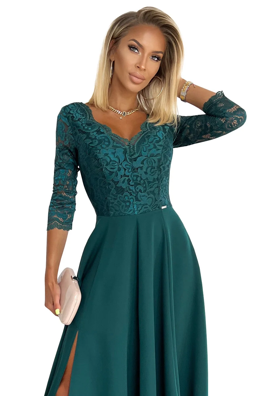 Pěkně vytvarovaný výstřih a vysoký rozparek ve spodní části šatů vytváří neobyčejnou kreaci v lahvově zelené barvě. Tyto šaty značky Numoco jsou polským výrobkem.