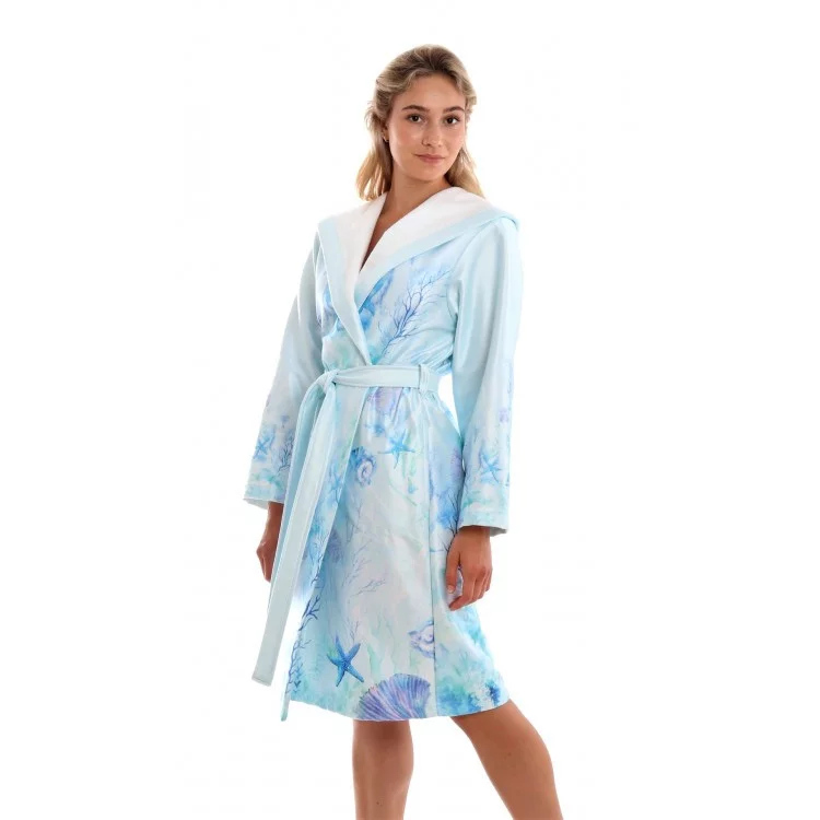 ANJU župan s kapucí panelový tisk moře délka : 105cm jednotná délka u všech velikostí střih: župan s kapucí, kapsy v bočním, pásek, délka ke kolenům velikosti: S,M,L,XL