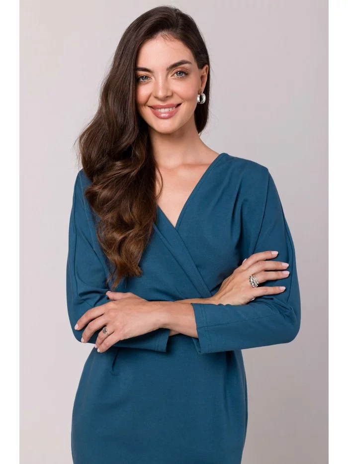 DETAILY PRODUKTU: úplet na bázi bavlny plášťové šaty se zavinovací horní částí přetaženou přes hlavu skrytý boční zip netopýří rukávy tříčtvrteční délka vypasovaná sukně ke kolenům s rozparky na zádech naše modelka je 172 cm vysoká a nosí velikost S navrženo a vyrobeno v Polsku