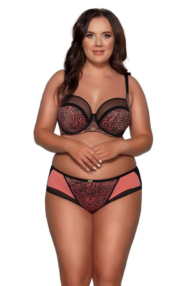 podprsenka 1130/3 TIGER byla navržena pro ženy s většími poprsí a nabízí jak oporu, tak stylový vzhled. Košíčky jsou vyrobeny z jemné pleteniny zdobené tygřím potiskem, který jim dodává výrazný a agresivní vzhled. Průsvitná síťovina, decentně zakončená elastickým lemem, dodává podprsence nádech lehkosti a elegance a vytváří smyslný efekt.