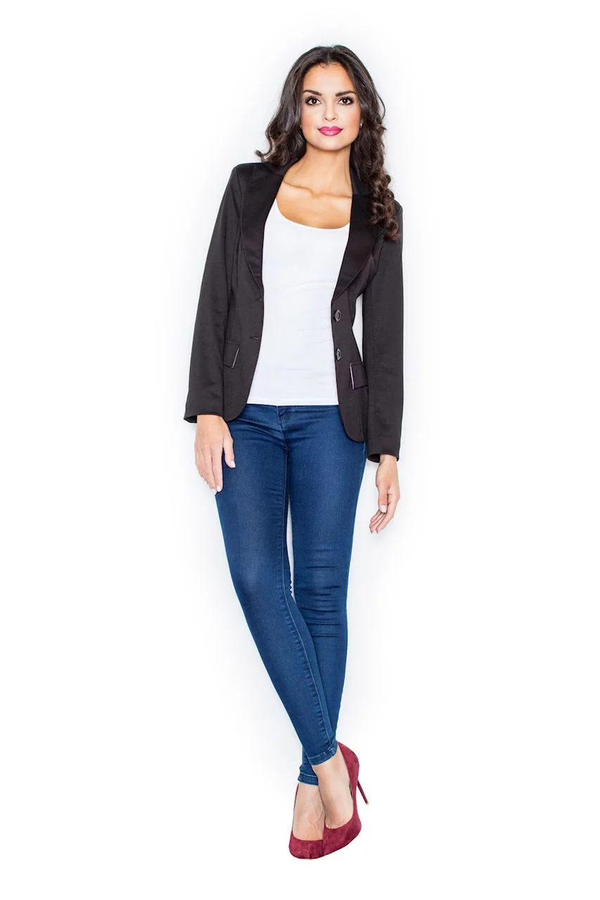 Dámské měkké sako s dlouhým rukávem, délka přes boky. Podšité. Zapínání na dva knoflíky. Na předním díle našité klopy - imitace kapes.