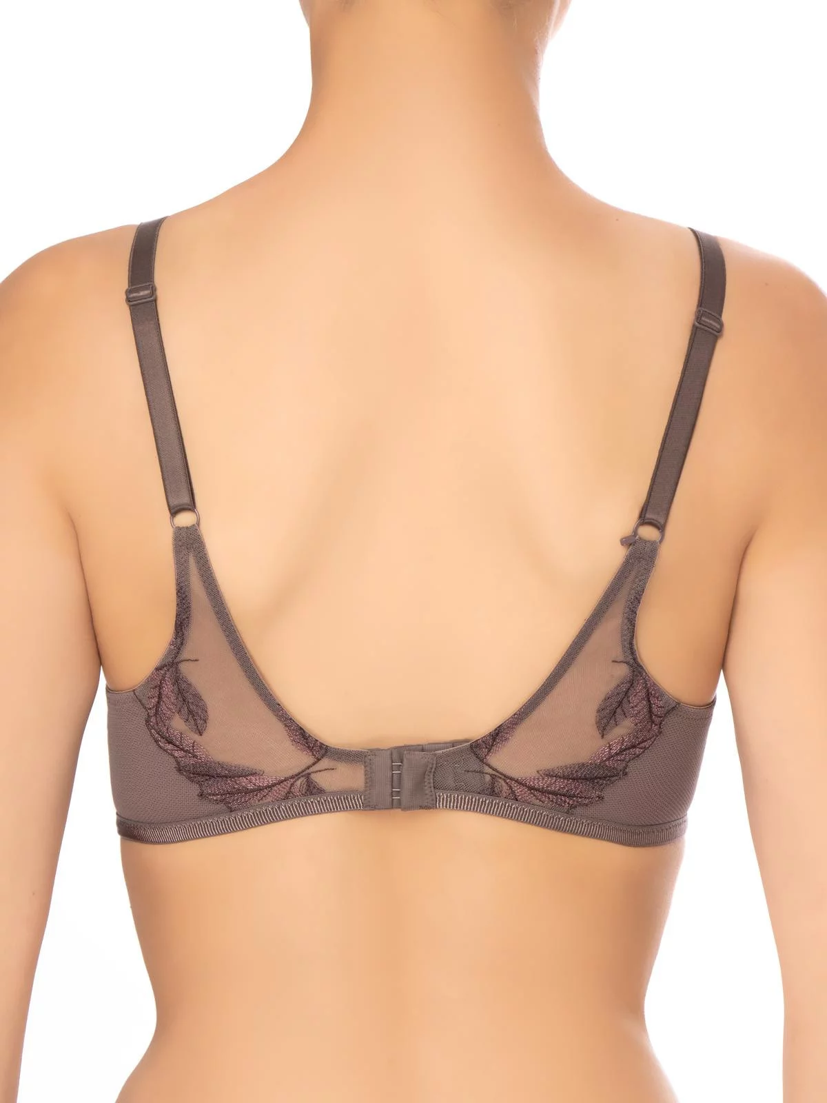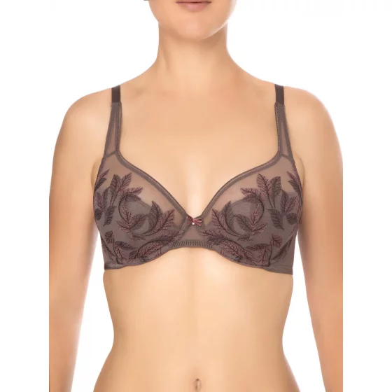 Dvojitě tvarované košíčky z nejkvalitnějšího tylu zvýrazní poprsí a vertikální střih ho dokonale zvedne. Vnitřní část košíčků tvoří jemná zpevňující pěna. Našitá rostlinná výšivka v odstínech hnědé a opalizující mědi mu dodává modernost.