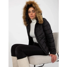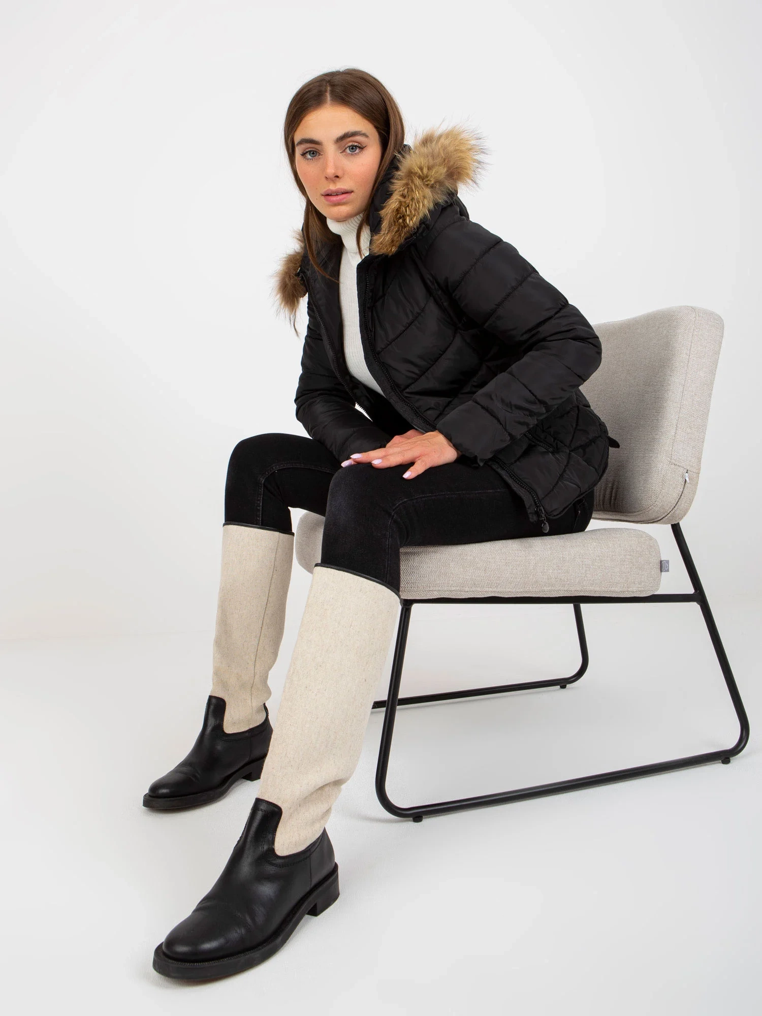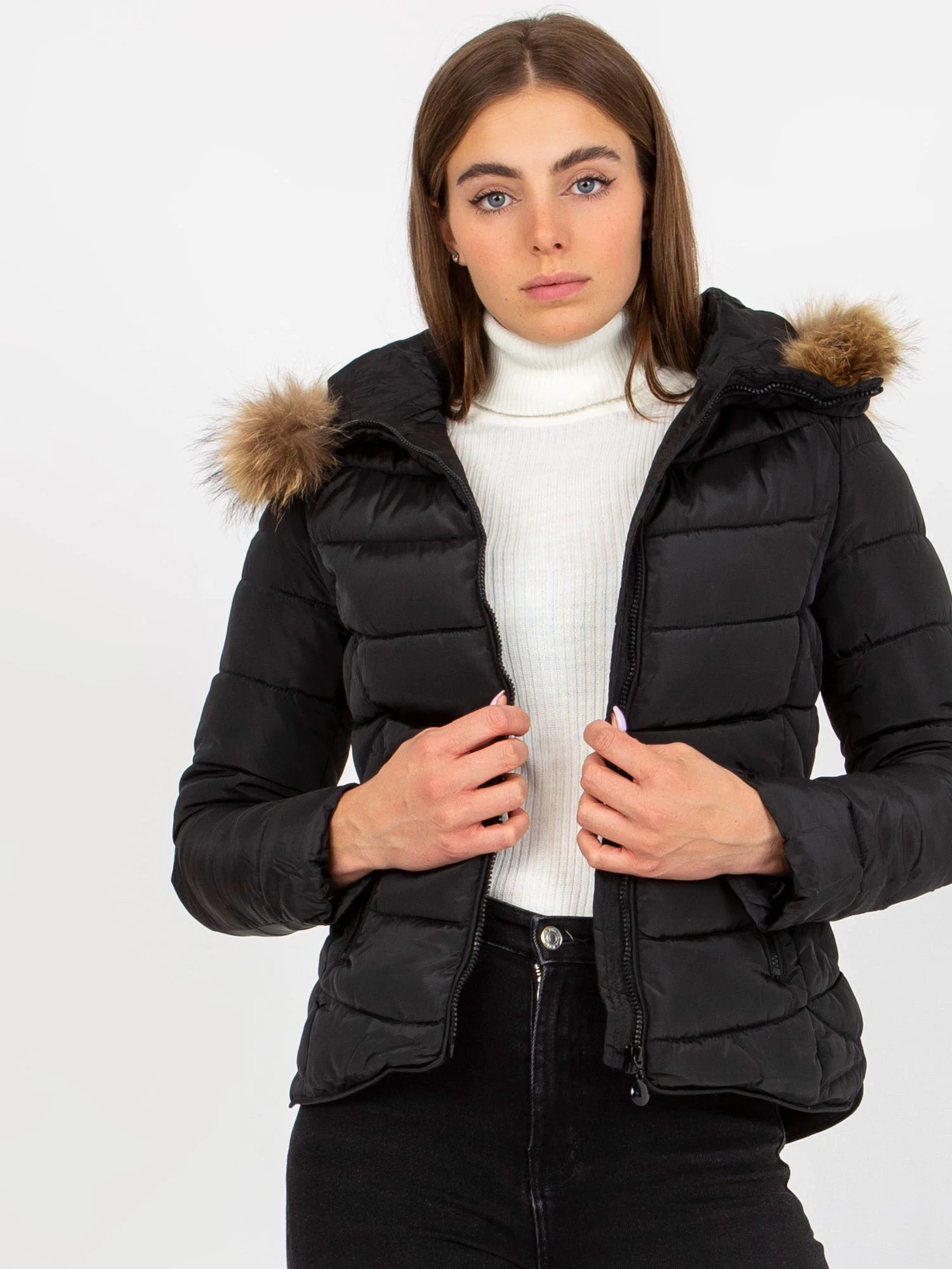 Černá prošívaná přechodová bunda s kožešinou na kapuci .