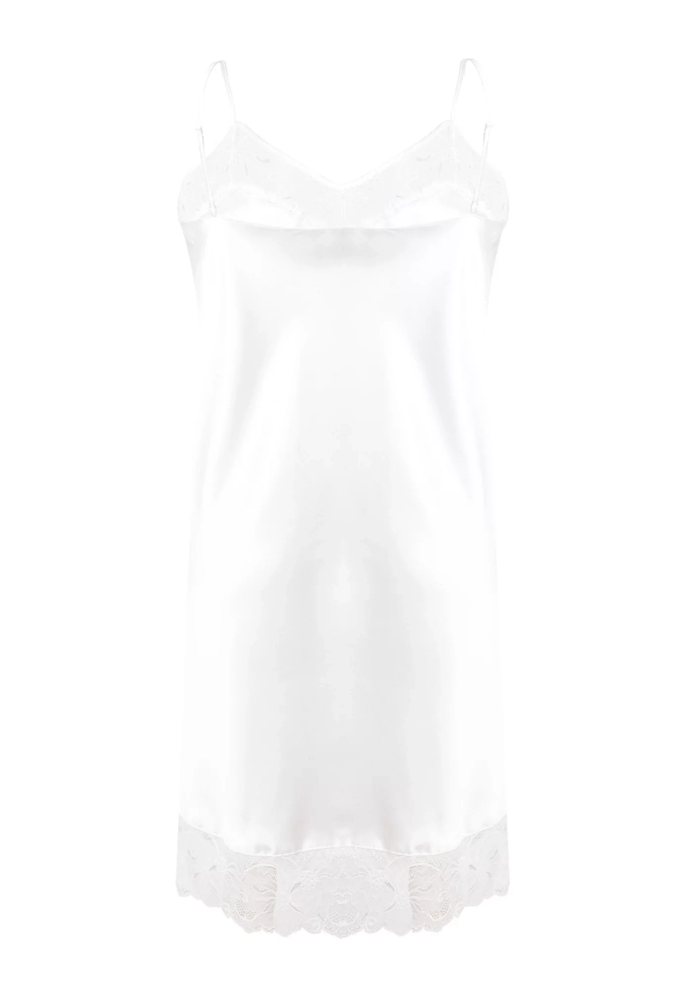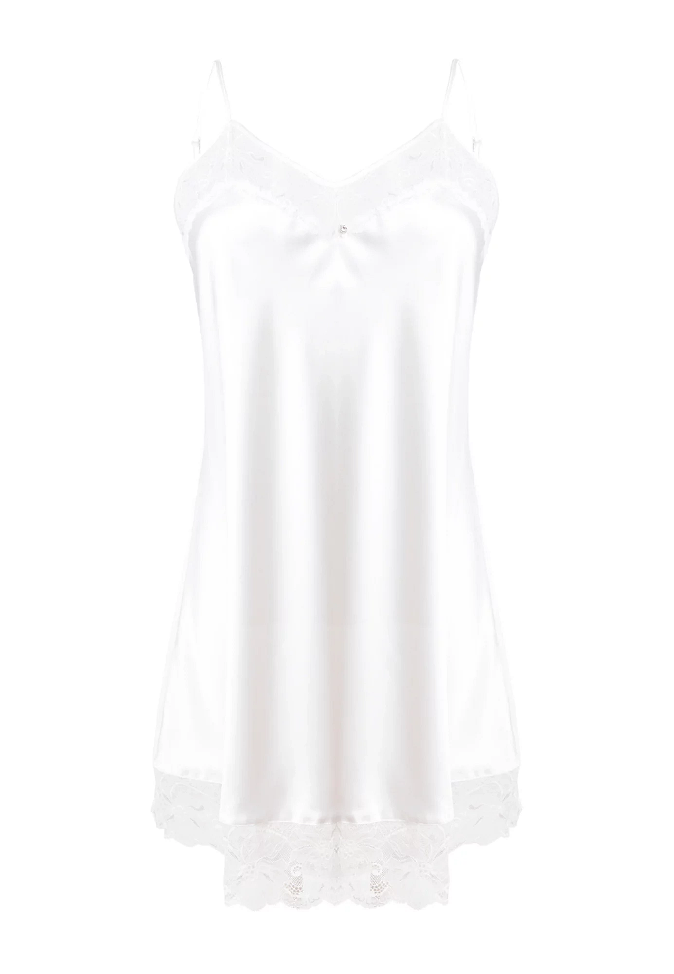 Krajkový výstřih a spodní okraj košilky dodávají celému modelu na eleganci a stylu. Spojení košíčků je ozdobené lesklým zirkonem. Košilka má tenká ramínka, jejichž délku je možné nastavit. Lehce rozšířený střih směrem dolů je zárukou pohodlí a komfortu při nošení.