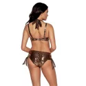 Multifunkční plavky udělají na pláži opravdový rozruch a množství podob, které SK 166 má, je opravdu působivé. Tato vyztužená podprsenka bardotka poskytuje stabilní oporu a dokonale tvaruje poprsí i po odepnutí ramínek. Zajímavým nápadem je všití širokého měděného pásku do boků podprsenky, který lze uvázat mnoha způsoby: jako ozdobný uzel na zádech, vpředu na prsou v podobě efektní mašle nebo na zátylku jako podpůrnou oporu prsou. Elastický úplet strój je celý pokryt hadím potiskem, který na povrchu látky vytváří jemnou strukturu, a samotné plavky se krásně třpytí kovovými třpytkami. Sada obsahuje kalhotky SF 166/10 a podprsenku SF 166/10/B s koketním starozlatým vázáním na bocích.