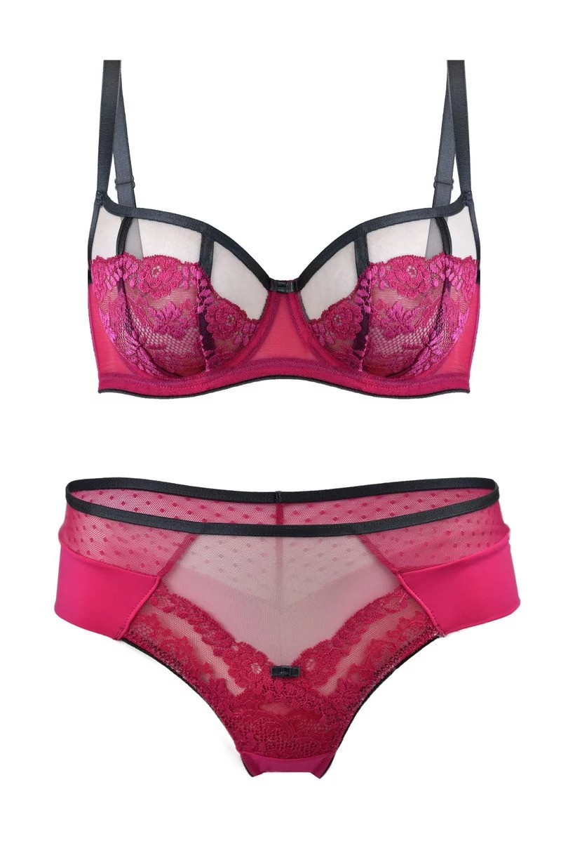 Košíčky jsou vyrobené ze síťoviny, na kterou je našitá krajka v amarantové barvě. Lemovky v grafitové barvě překrývají svislé švy. Model dokonale zvýrazňuje poprsí.
