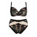 Vrchní linii modelu a můstek zdobí pěkná výšivka s červenými květy. Ramínka jsou ozdobná. Model má stabilní obvod a je ozdobený zlatými detaily. Podprsenka má střih a konstrukci vhodnou pro ženy se středně velkým a velkým poprsím.