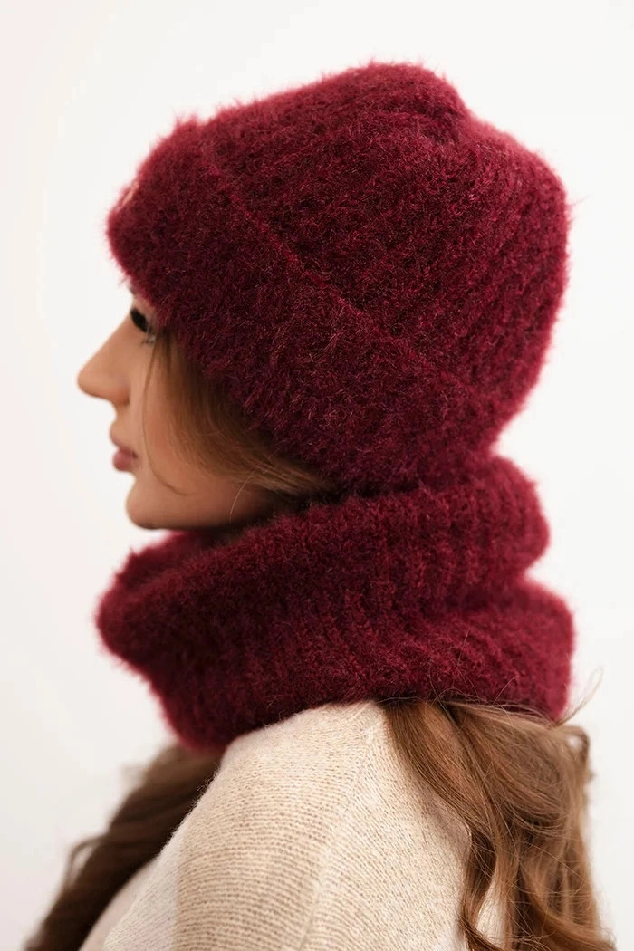 Sada skládající se z čepice a nákrčníku, vyrobená z nadýchané a měkké pleteniny s příjemnou strukturou