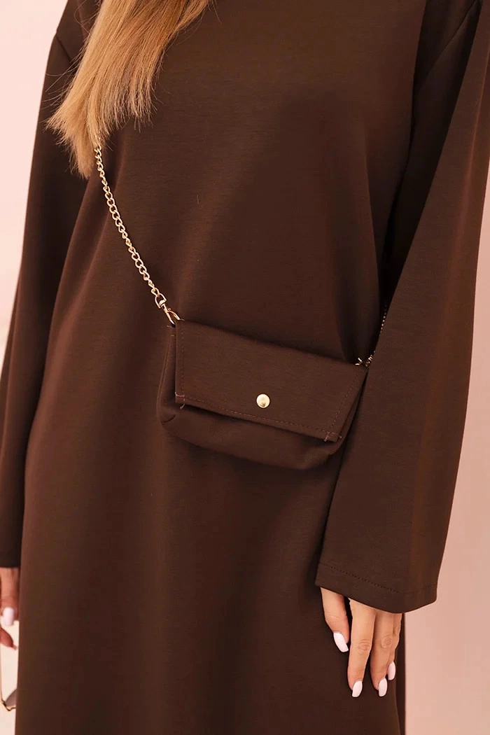Detaily: taška na zlatém řetízku, dlouhý rukáv, kulatý výstřih