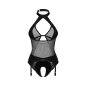 Lesklá imitace kůže v kombinaci s průsvitnou síťovinou vytváří body, které upoutá pozornost a podnítí fantazii. Svůdný design s otevřeným rozkrokem vzbuzuje zvědavost, zatímco obojek obepínající krk dodává nádech smyslné odvážnosti. Ramínka zdůrazňují křivky těla. Možnost připevnění punčoch vám umožní dotvořit vzhled s extra šmrncem.