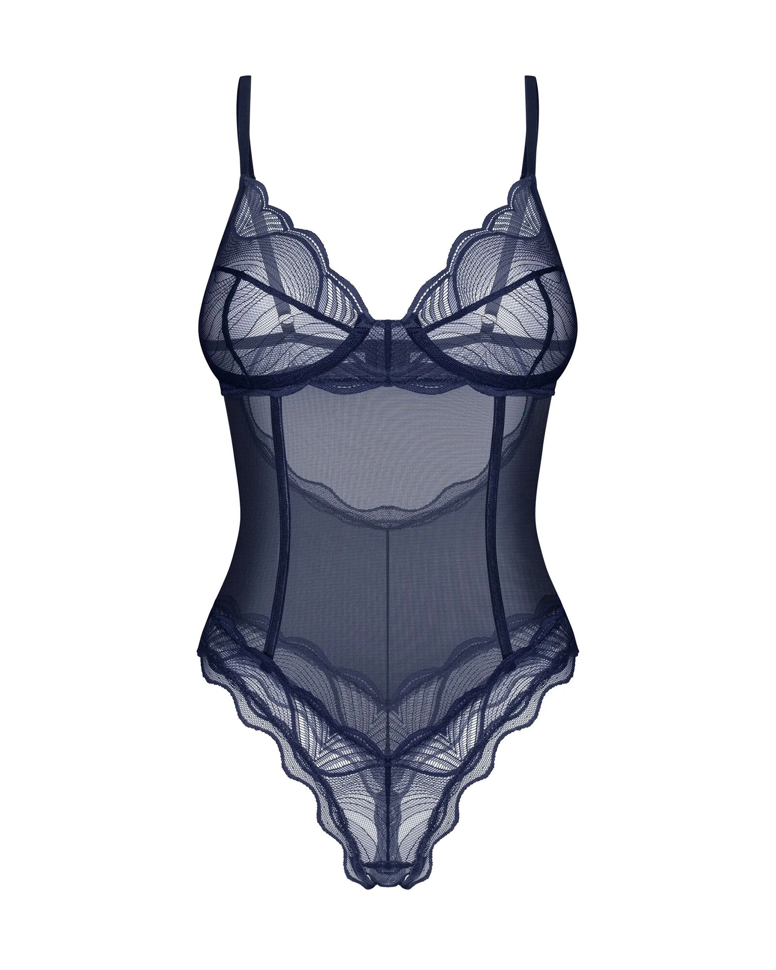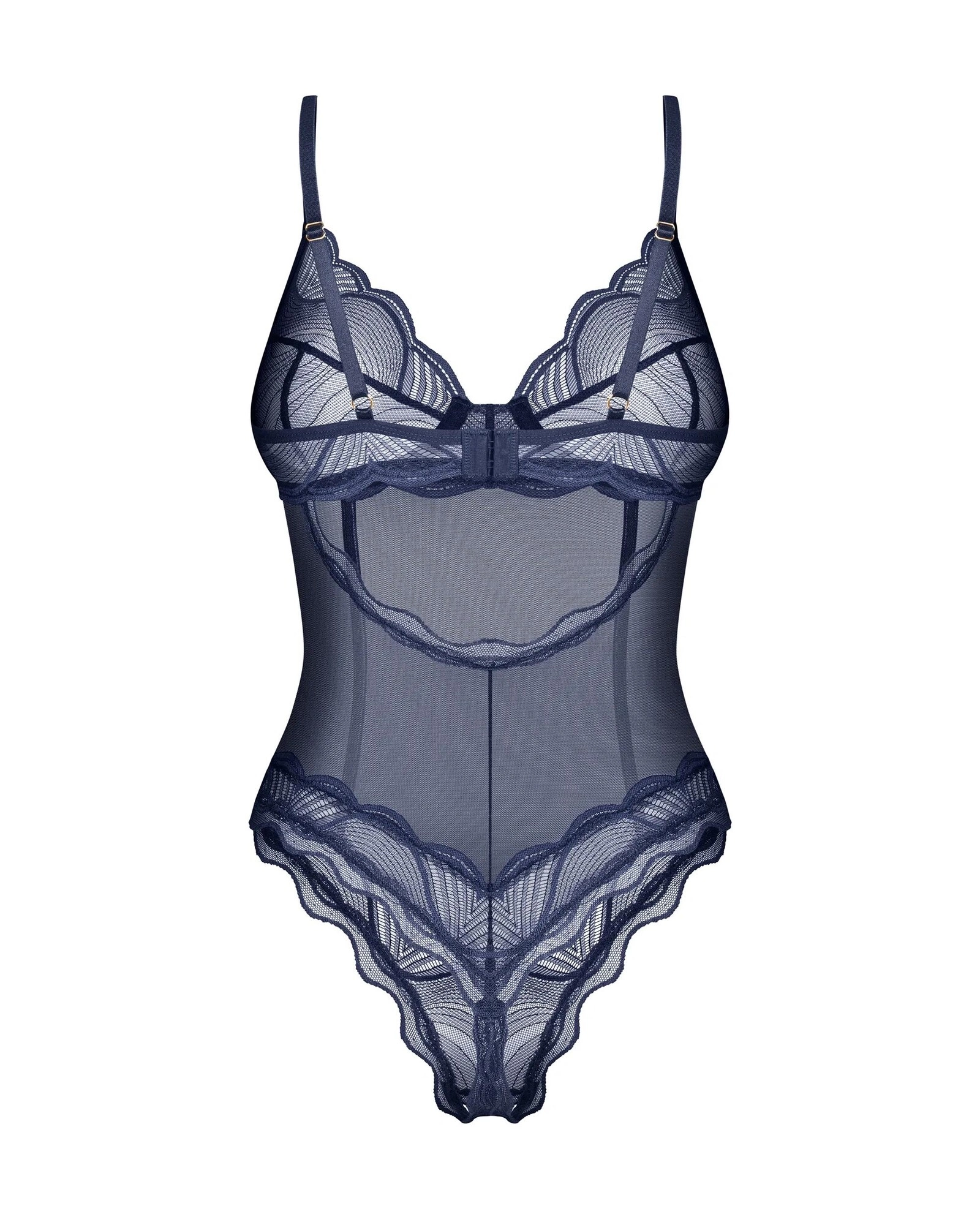 Odhalte své nejhlubší touhy s nočním modrým body bez rozkroku. Tento smyslný kousek v tmavě modré barvě je vyroben z kombinace průsvitné látky a jemné krajky zdobené složitými výšivkami. Design zdůrazňuje vaše křivky díky odvážnému otevřenému rozkroku, odhaleným zádům a vycpaným košíčkům s kosticemi, které poskytují oporu i přitažlivost.