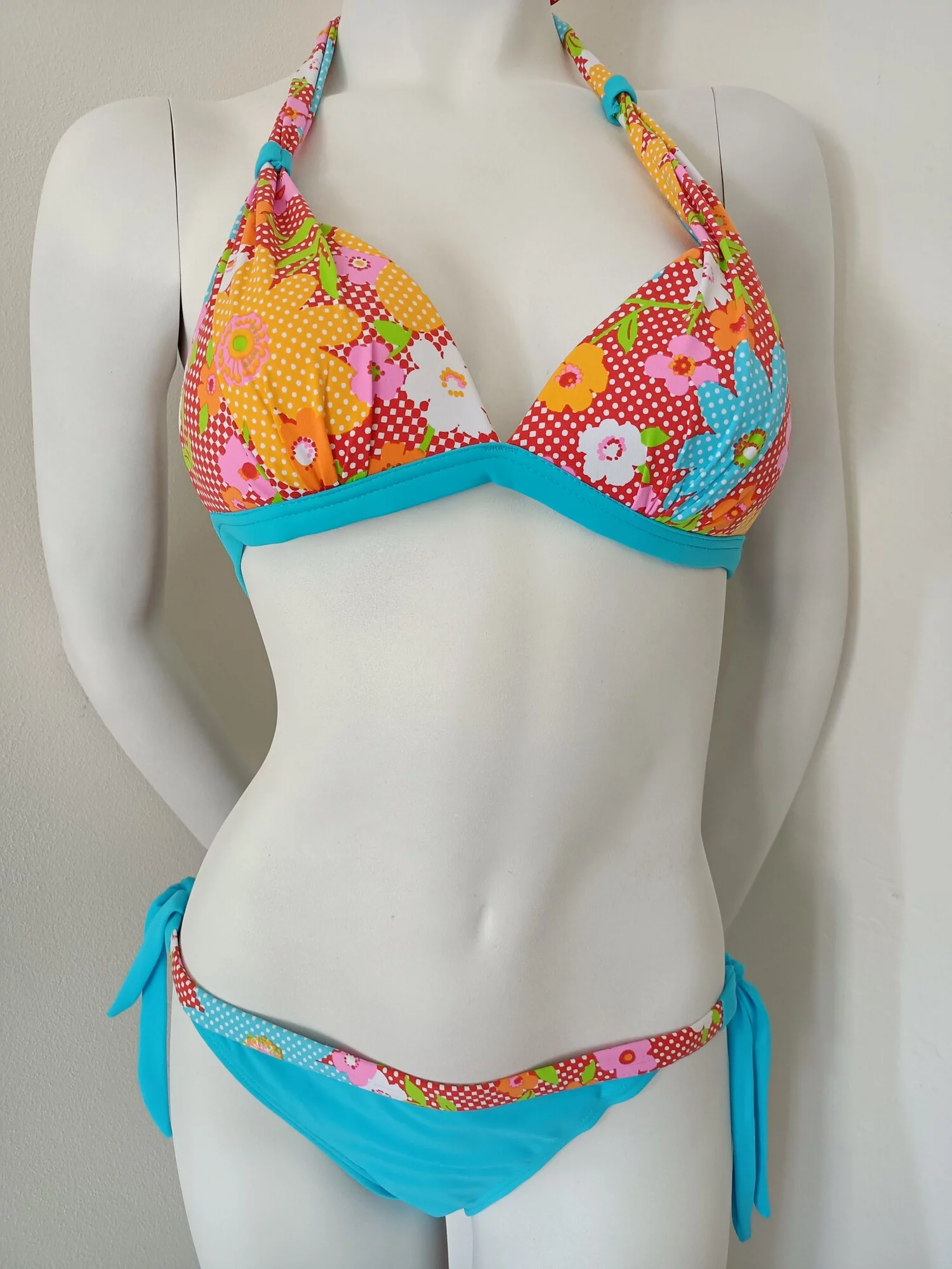 Dámské dvoudílné plavky. Trojúhelníkové vyztužené košíčky, bez kostic. Zavazování za krkem a na zádech.