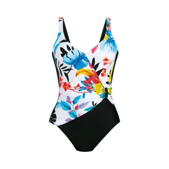 Tyto vyztužené plavky ze série "Green Tropics" vytvářejí zeštíhlující efekt díky asymetrickému bočnímu volánku, který je ozdobený kovovou sponou.