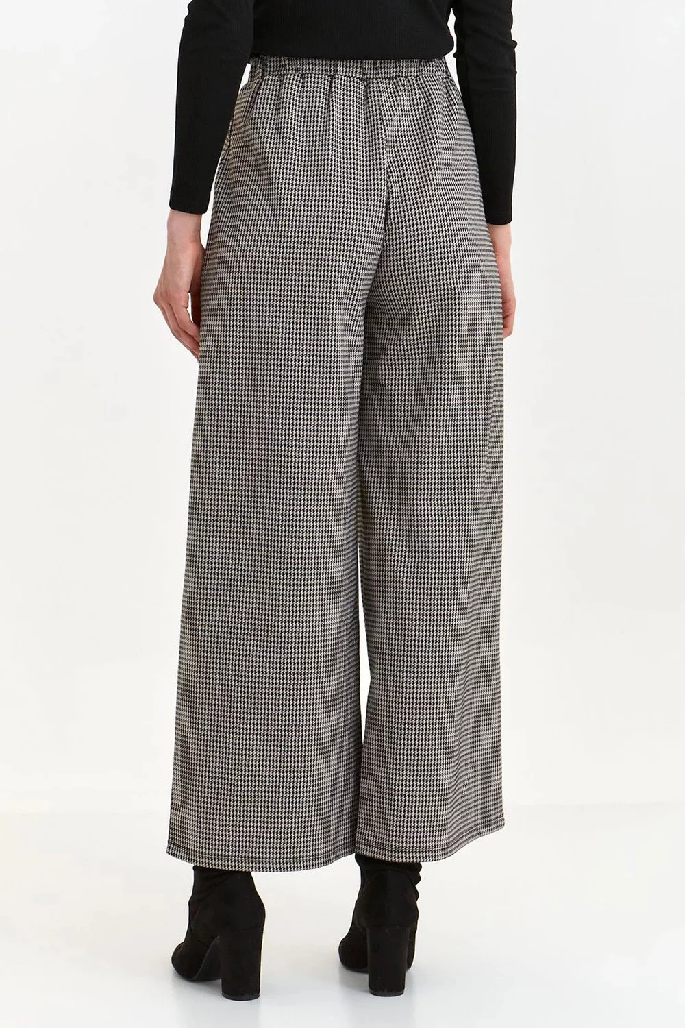 Tyto dlouhé dámské kalhoty s extra širokými nohavicemi zaujmou svou neobvyklou elegancí a jedinečným stylem. Mají praktickou gumu v zadní části pasu a nápadné a velké boční kapsy. Kalhoty jsou vyrobeny z příjemného na dotek a kvalitního úpletu, po celé délce mají nápadný peplitový vzor. Budou se skvěle hodit k různým podzimním/zimním outfitům do práce i na slavnostní večeři s přáteli. Kalhoty jsou k dispozici v béžové barvě.