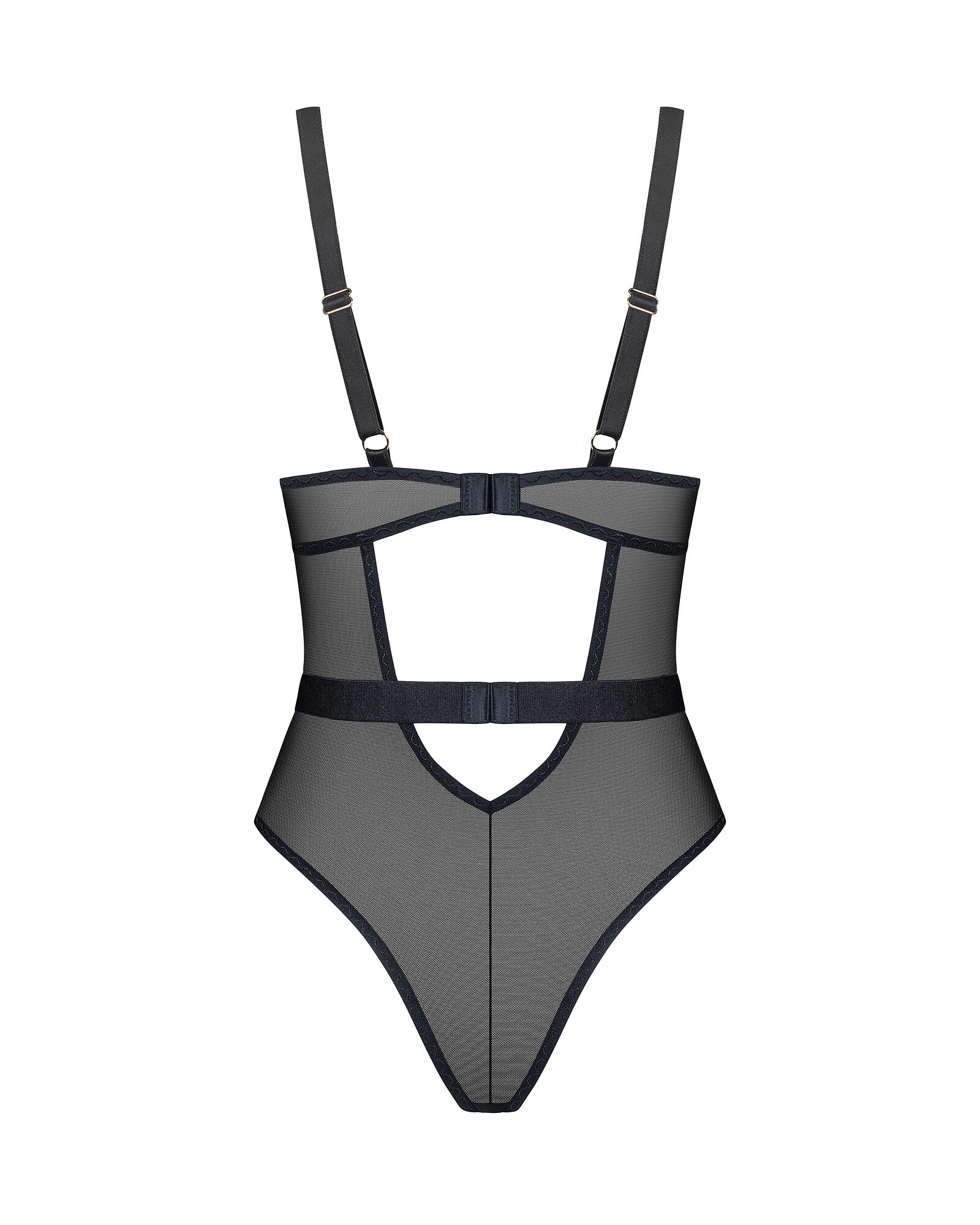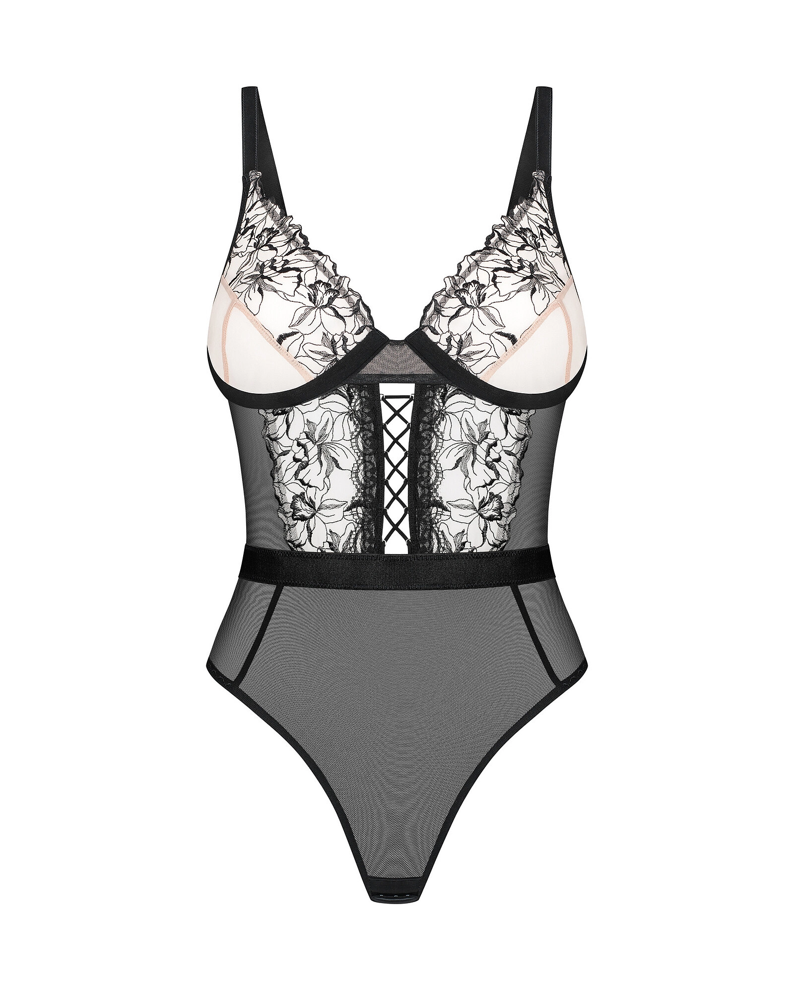 Kombinace luxusních materiálů a květinové fantazie. Body s kosticemi pro dokonalou oporu a šněrováním vpředu. Vytváří neodolatelnou siluetu díky vysokému střihu v oblasti boků, zatímco široký pás zvýrazňuje pas a výřez na zádech nabízí svůdné náhledy. Možnost nastavení zaručuje dokonalé padnutí. Vyrobeno z průsvitné, pružné síťoviny. Tylové košíčky zdobené jemnou květinovou výšivkou. Kvetoucí elegance a mozaika smyslných textur.