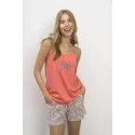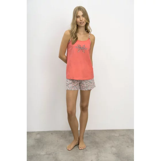 Dvoudílné dámské pyžamo pro pohodlný spánek. Komplet sestává z jednobarevné košilky na ramínka s kulatým výstřihem, který dopňují krátké šortky s potiskem domečků s pohodlnou gumou v pase. Pyžamo je vyrobené z vysoce kvalitní, genetický nemodifikované řecké bavlny, která poskytuje vysoké pohodlí, příjemný pocit na dotek, prodyšnost, pružnost a odolnost.