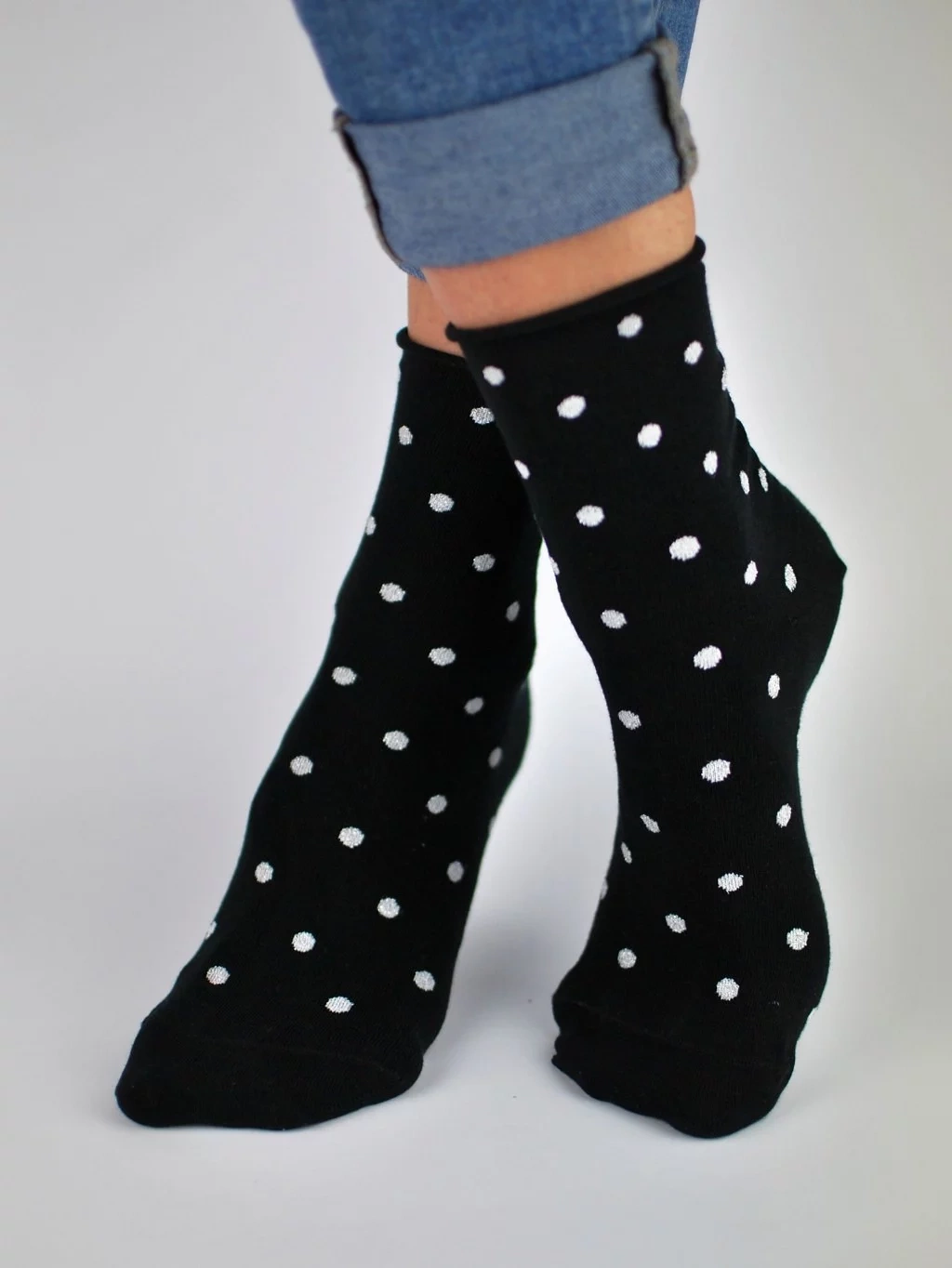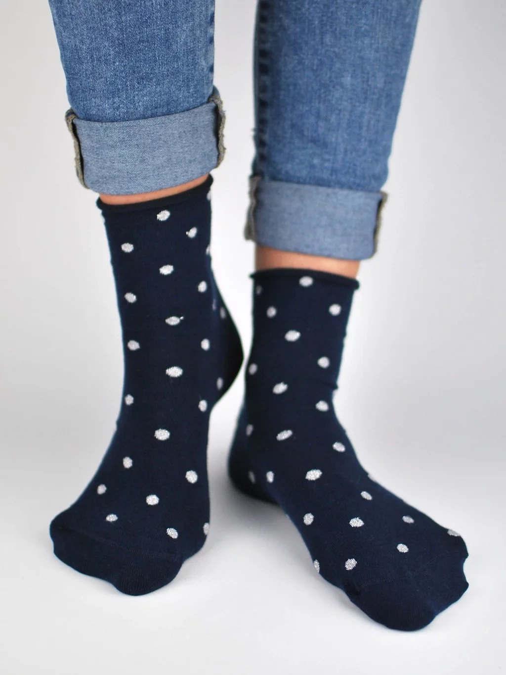 Dámské bavlněné ponožky, které jsou ozdobené lesklými puntíky.