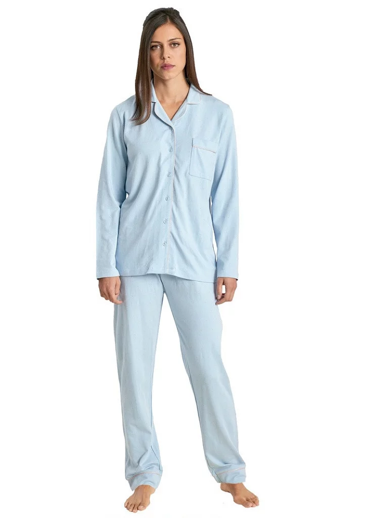 Dámské pyžamo španělské značky Muydemi. Vrchní část je celopropínací, knoflíky jsou obšité látkou. Klopy jsou do kulata a jsou obšité celé i podél propínání saténovým páskem. Na levé straně je našitá kapsička. Kalhoty jsou volné, splývavé. Pas je do gumy a dá se regulovat saténovým páskem.