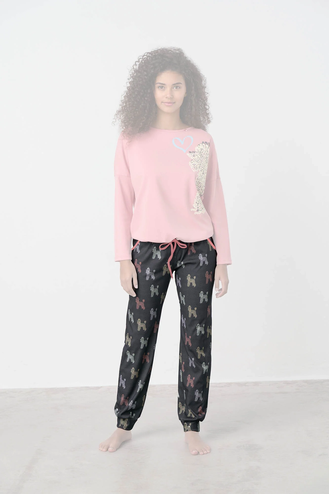 Dámské stylové pyžamové kalhoty s úžasným potiskem pudlů a šňůrkou v pase, které si prostě hned zamilujete! Kalhoty jsou vyrobené z vysoce kvalitní přírodní egejské bavlny, která poskytuje vysoké pohodlí, příjemný pocit na dotek, prodyšnost, pružnost a odolnost.