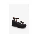 Perfektní dámské letní sandály! Mají vysoký klín a platformu zdobenou jutovým materiálem. Mají otevřený čtvercovou špičku. Sandály jsou připevněny na dlouhý, nastavitelný páskách s přezkou. Extrémně měkká ekologická stélka je velmi pohodlná pro používání po celý den. Tyto boty budou skvělým příslušenstvím ke vzdušným šatům nebo sukní.