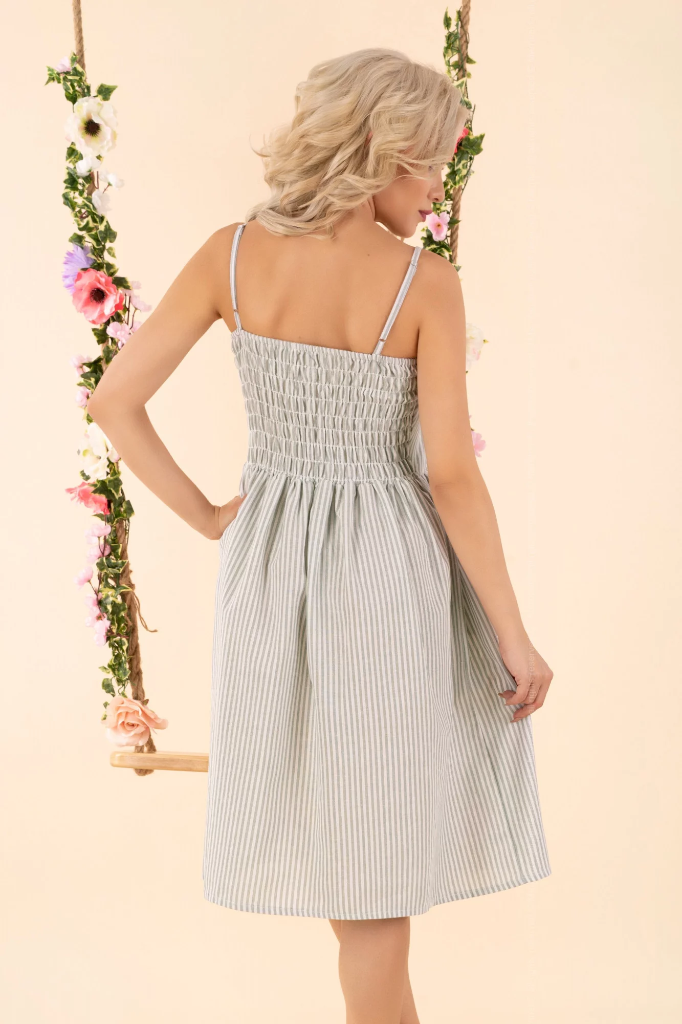 Dámské letní šaty na ramínka proužkované s kapsami a propínáním na knoflíčky. Zadní díl zdobený žab