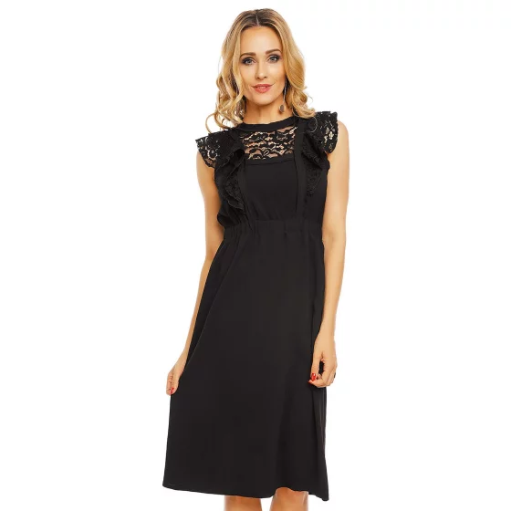 Jednoduché dámské šaty, které jsou doplněny krajkou. Tento model má velmi krátké rukávky, které zakrývají spíše jen ramena. Rukávky jsou tvořeny krajkou ze dvou vrstev. Krajka sahá téměř po pás a to v přední, ale i zadní části tohoto modelu. Šaty jsou bez výstřihu. Je lehce odhalen pouze dekolt, který je zakrytý stejnou krajkou. V pase je guma, která je velmi elastická. Následuje delší hladká sukně, která sahá pod kolena. Zapínání u tohoto modelu je řešeno pouze knoflíkem za krkem, jinak jsou záda lehce odhalená. Oblečte si tyto šaty na společenskou událost, večírek nebo posezení s přáteli.