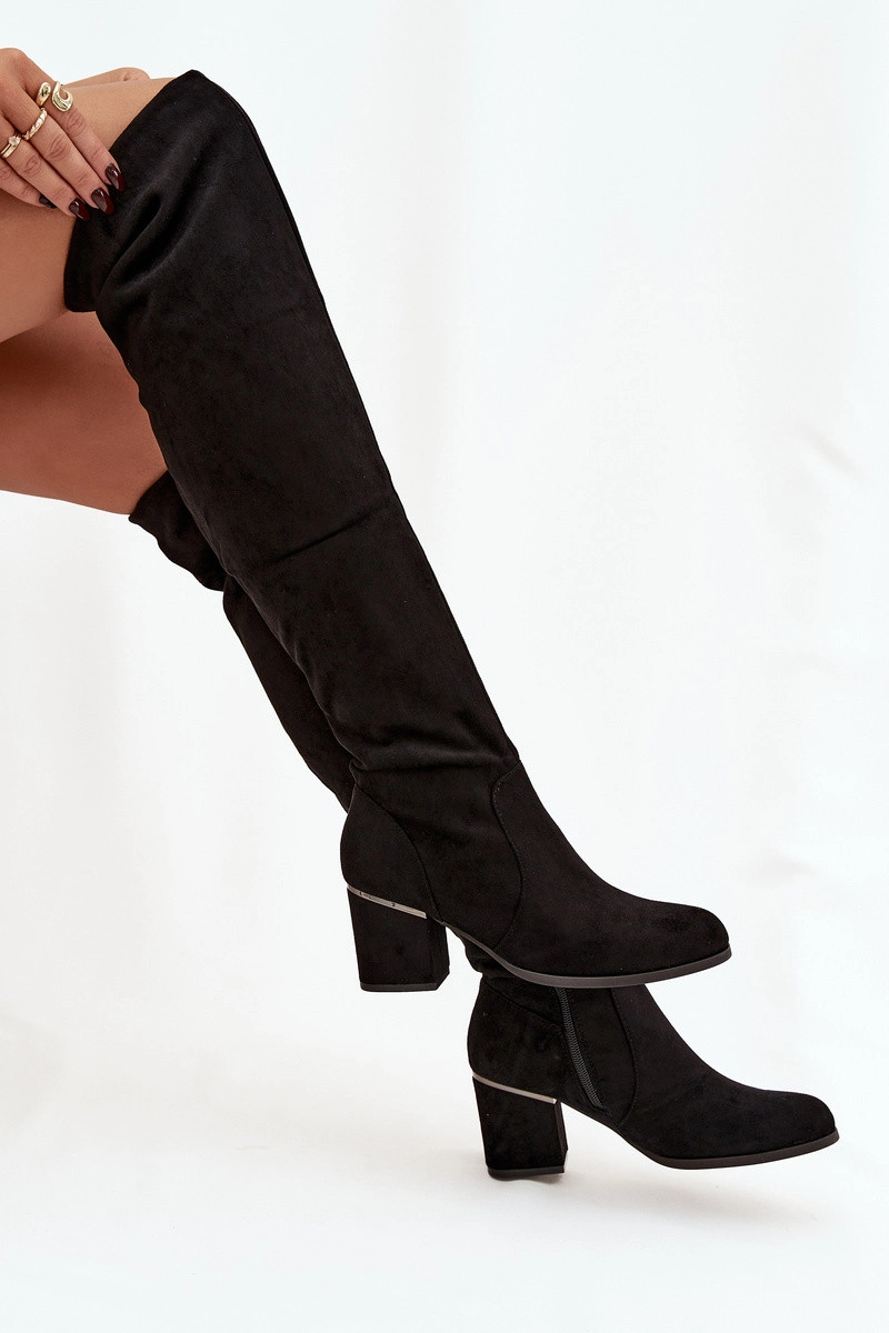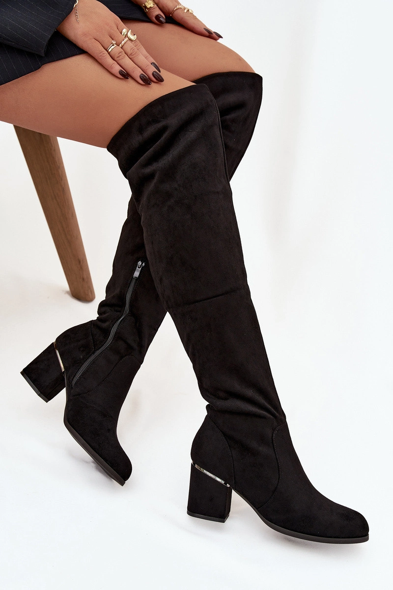 Dámské kozačky vyrobené z ekologického semiše jsou elegantní volbou pro ženy, které ocení styl a pohodlí. Dosahují za koleno a jejich přiléhavý horní díl krásně zvýrazňuje linii nohou, čímž dodává postavě štíhlý a ženský vzhled. Jemně zaoblené špičky. Model s zipem na spodní straně horní části. Osazeny na podpatku, vypadají mimořádně stylově. Tyto kozačky se skvěle hodí do podzimních a zimních stylizací – jak s přiléhavými kalhotami, tak s krátkými šaty nebo sukněmi. Při výběru velikosti, prosím, řiďte se tabulkou velikostí. Při výběru velikosti se řiďte tabulkou velikostí.