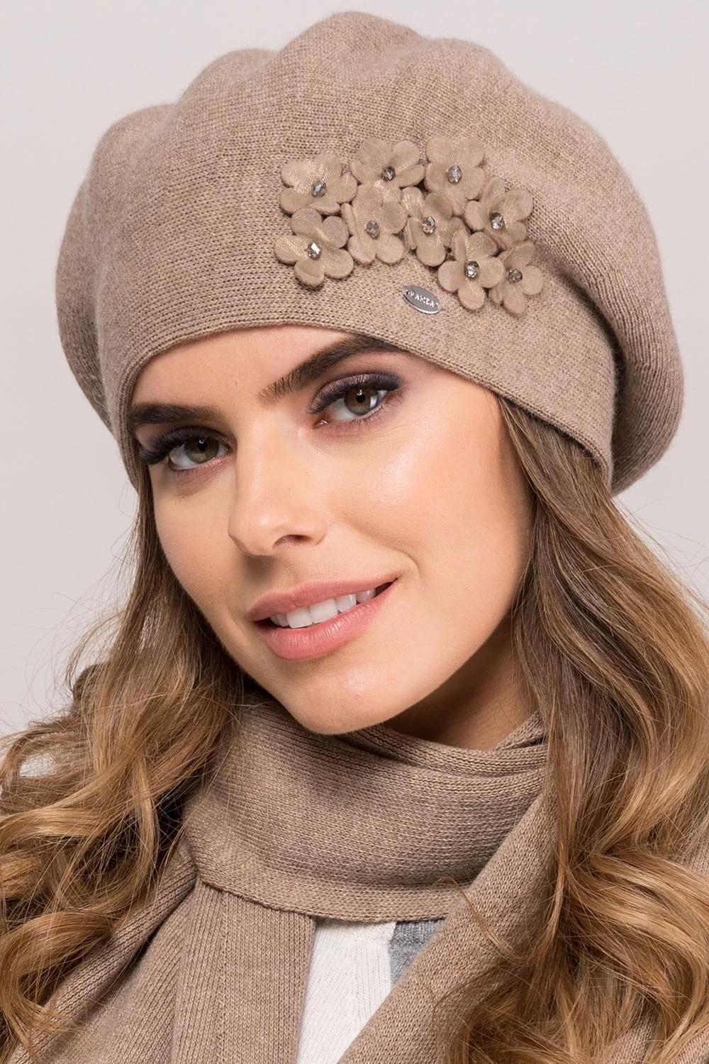 Baret je ideálně vypasovaný a je vyrobený z teplé příze s přídavkem vlny. Ve přední části je model ozdobený květinovou aplikací a korálky. Baret je skvělou volbou pro zimní dny.