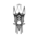 Silná, odvážná a neodolatelně smyslná – sada, která roznítí fantazii. Korzet z lesklé látky a síťoviny krásně tvaruje siluetu, zatímco křížené pásky vpředu a vzadu zdůrazňují jeho svůdný charakter. Košíčky s kosticemi dodávají poprsí nádherný tvar a tanga bez rozkroku přidávají provokativní nádech. Kolekce Dominna spojuje moderní design s odvážnou pikantností.