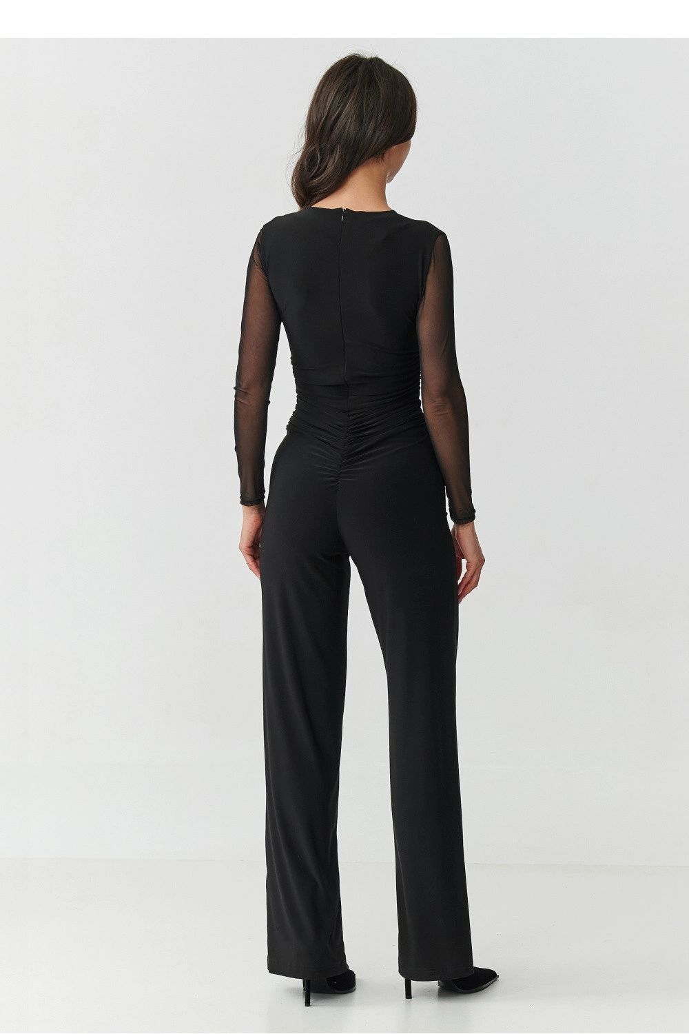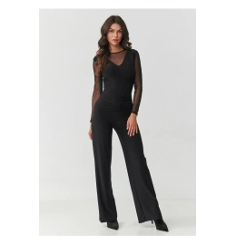 Tento jedinečný černý dámský overal je kvintesencí moderní elegance. Navržený s ohledem na ženy, které si cení pohodlí, ale nechtějí se vzdát elegancie a třídy, bude ideální na večerní výlet, koktejlovou párty nebo elegantní večeři. Horní část overalu okouzlí jemnými vložkami z tylu, dlouhými poloprůhlednými rukávy a výstřihem ve tvaru písmene V, který dodává celku lehkost a smyslnost, zůstávajíc zároveň elegantní a stylový. Přizpůsobený střih v pasu krásně zdůrazňuje postavu, zatímco široké přímé nohavice dodávají celku charakter a opticky prodlužují nohy. Zapíná se na zip vzadu, overal zaručuje pohodlí nošení a ideální přizpůsobení postavě. Je to ideální volba pro ženy, které chtějí vyniknout v davu, volí stylovou alternativu k večerní šaty. Tyl: 100% polyester.