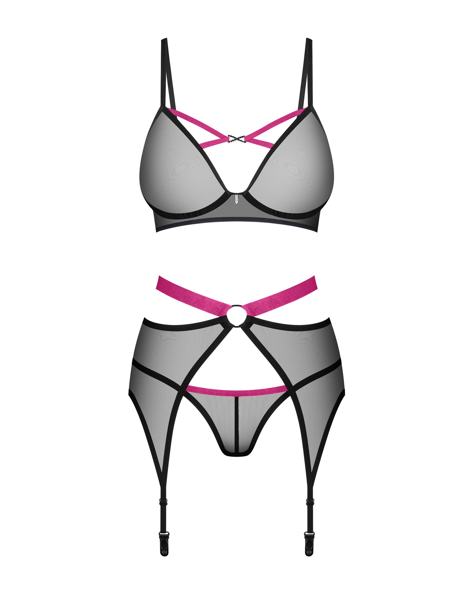 Třídílná souprava z kolekce Novenes elektrizuje a ohromuje svým smyslným designem! Skládá se z podprsenky, tang a podvazkového pásu. Je vyrobena z černé průsvitné látky, zdobené fialovými akcenty a lesklými detaily. Její perfektní střih zaručuje svůdný vzhled a pohodlí při nošení. Přesvědčte se sami, jak mocná může být!