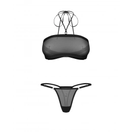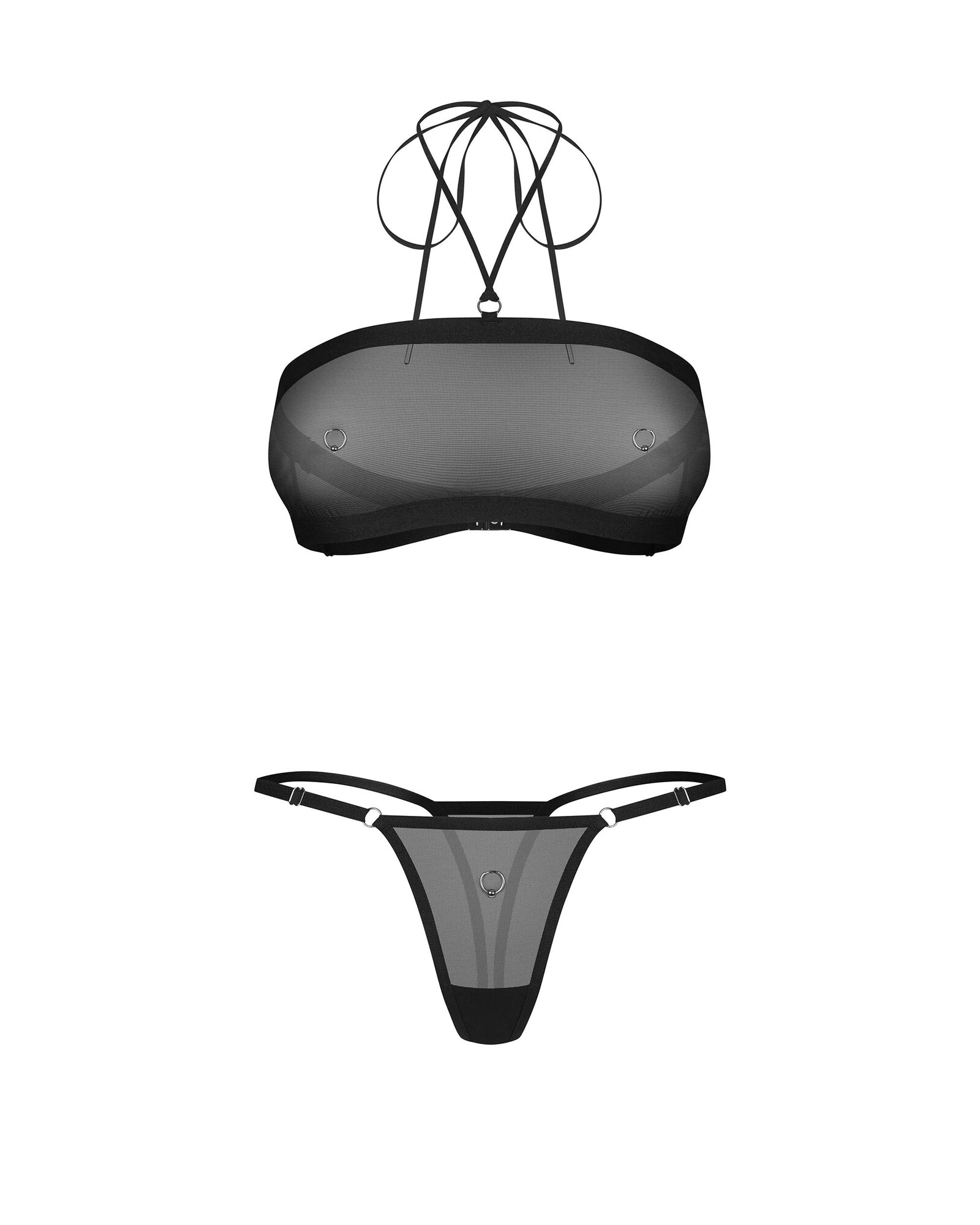Top a tanga z průhledné síťoviny v moderním minimalistickém stylu. Elastický materiál se jemně přizpůsobí tělu, zatímco široký podprsní pás stabilizuje střih a zdůrazňuje siluetu. Jemné kovové detaily na přední straně dodávají designu lehce provokativní charakter. Perfektní set pro ženy, které rády zdůrazňují svůj individuální styl.