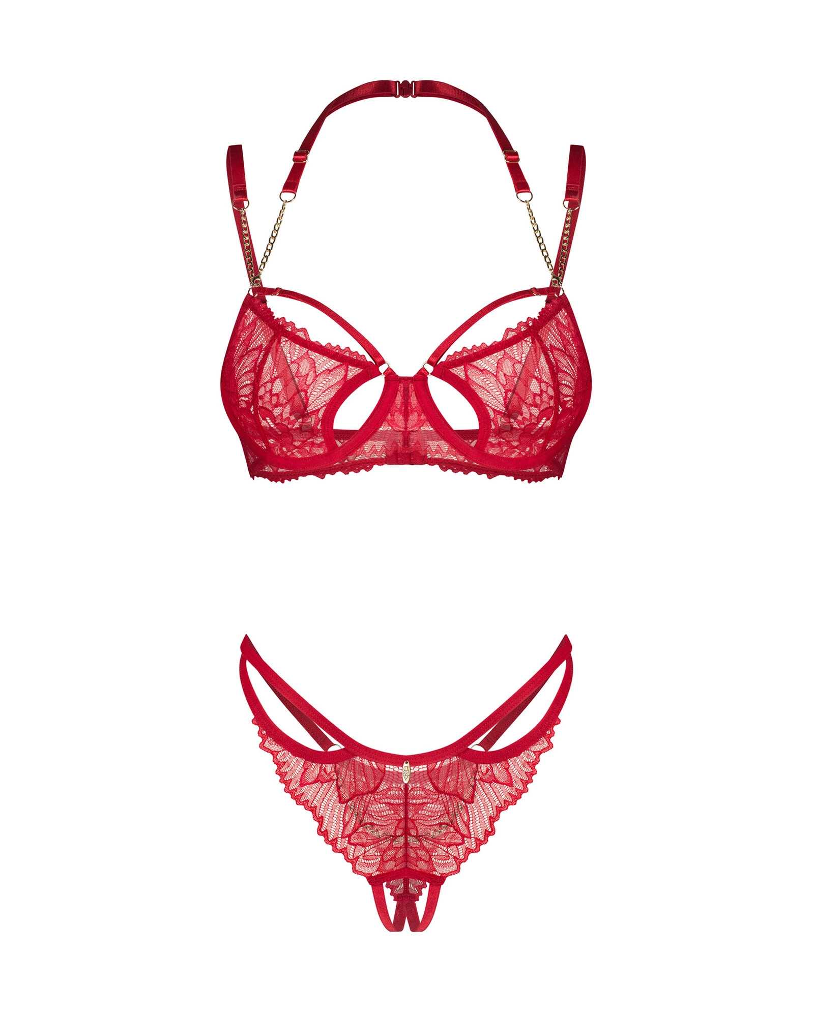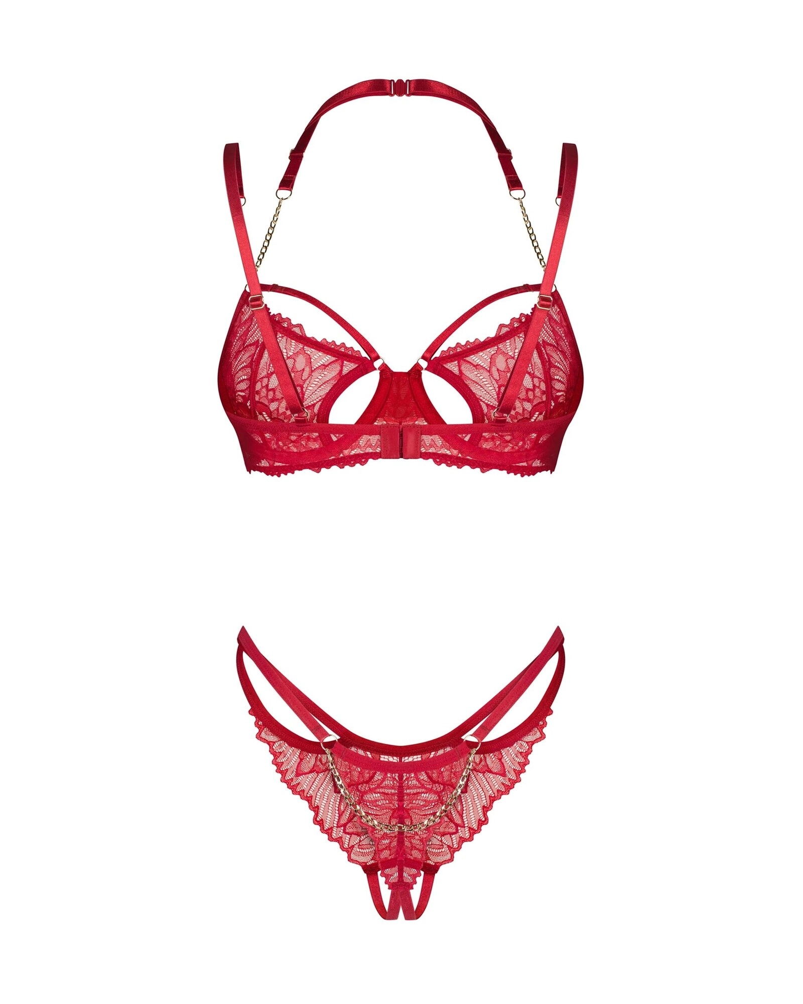 Sytě červená barva, elegantní krajka a detaily, které nikdo nepřehlédne. Podprsenka s kosticemi jemně zdůrazňuje poprsí, zatímco zlaté řetízky na ramínkách dodávají jedinečný nádech. Tanga s otevřeným rozkrokem, zdobená krajkou a třpytivým řetízkem přes zadní část, jsou čistou fantazií. Každý detail zde má svůj význam – dokonce i malý přívěsek vpředu, který koketně upoutá pozornost. Je to více než jen spodní prádlo. Je to příslib večera plného potěšení a vášně.