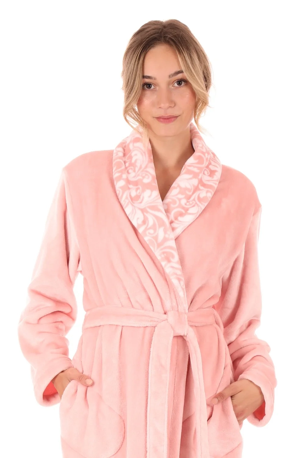 Svůdně a přitom pohodlně se budete cítit s županem Flora vyrobeným z luxusního materiálu flannel fleece s decentním květinovým vzorem, který kombinujeme s jendnobarevnou variantou pro dosažení moderní a zároveň nadčasové elegance. Tento župan je lehký, ale zároveň hřejivý, ideální pro chladnější rána a dlouhé večery. Střihová fazona se šálovým límcem, dvěma kapsami v bočních švech a páskem skvěle padne. Má klasickou délku, která poskytuje dostatečné pokrytí nohou při sezení a zároveň nepřekáží při chůzi. Materiál má velmi krátký vlas a díky tomu nemá velký objem a nebude vám přidávat nechtěné centimetry. Je sametově hebký a lesklý. Dopřejte si pocit výjimečnosti každý den.