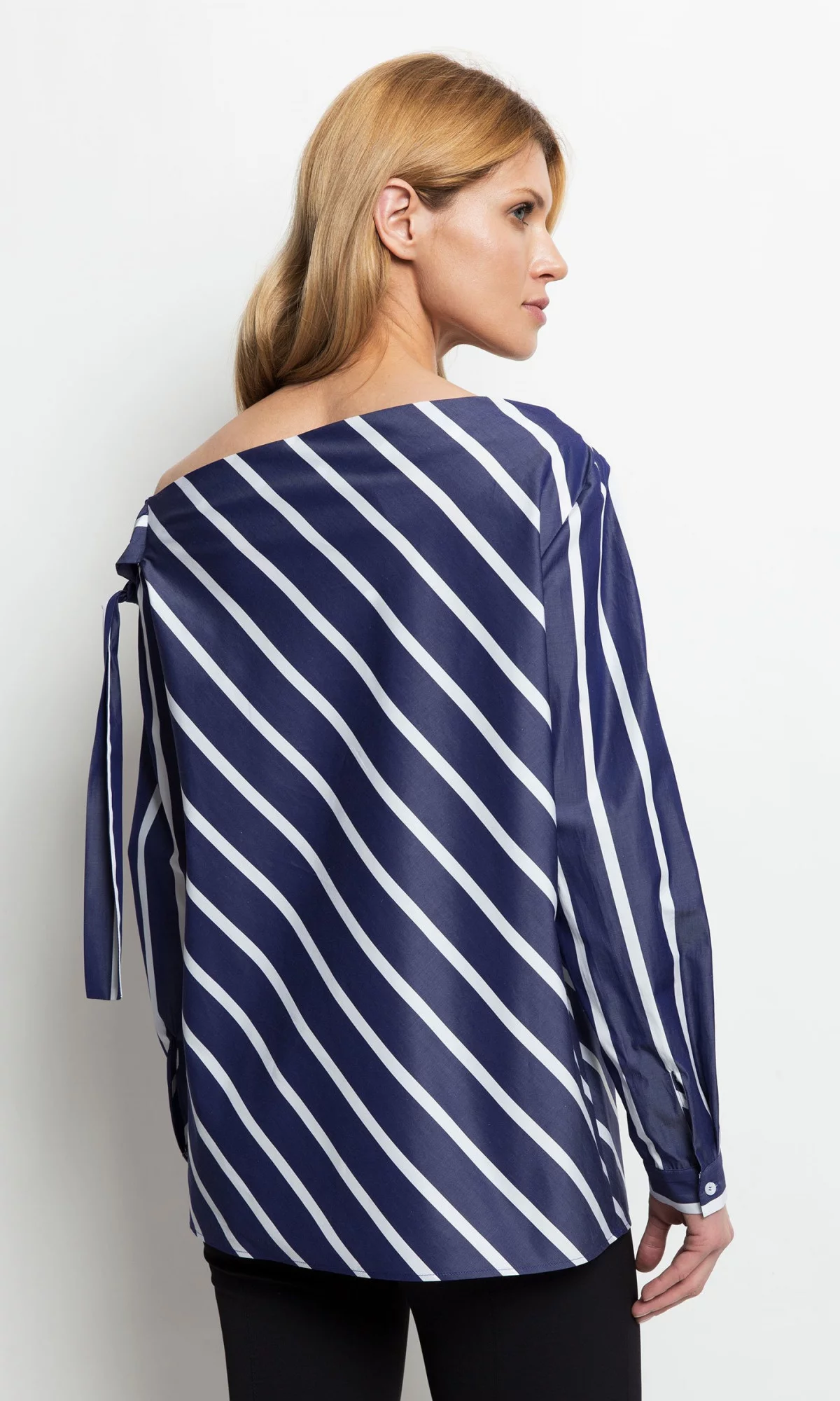 Bavlněná blůza s námořnicky modrými a bílými pruhy na ramínka a ozdobným zavazováním na šňůrku. MaVíce