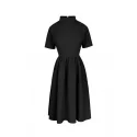 Šaty s přiléhavým horním dílem, reglánovými rukávy a zajímavým ohrnutým límcem. Díky zvýrazněnému pasu a rozšířené spodní části jsou šaty velmi ženské a reagují na každý váš pohyb. Šaty se zapínají na skrytý zip.