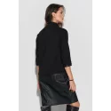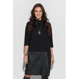 Jednoduché a ležérní over size šaty se stojáčkem skvěle doplní pracovní vzhled. Šaty jsou k dispozici v černé barvě a kombinují mikinový úplet s elegantní matnou eko kůží. Rukávy poskytují dostatečnou volnost pohybu. Délka pod kolena zvýrazňuje nohy v jejich nejštíhlejší části. Proto lze šaty volně nosit s kozačkami nebo botami. Na zadní straně šatů je kožená nášivka s logem Numinou. Ideální střih pro ženy, které se cítí sebevědomě díky volnosti v oblasti břicha a ramen.