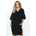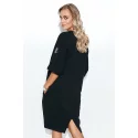 Ležérní mikinové šaty nadměrné velikosti, které se hodí na víkendové odpoledne i na prodloužený den v práci. Je to typ šatů, které můžete nosit na mnoho způsobů a pokaždé vypadat úplně jinak. Šaty jsou jednoduché, a proto je v nich použito mnoho zajímavých dekorativních prvků. Má geometrický střih a na zadní straně je mírně projmutý pro snadnější používání. Na jednom z rukávů je ozdobná aplikace. Srdíčkový výstřih zajišťuje, že silueta v šatech nepůsobí těžce.