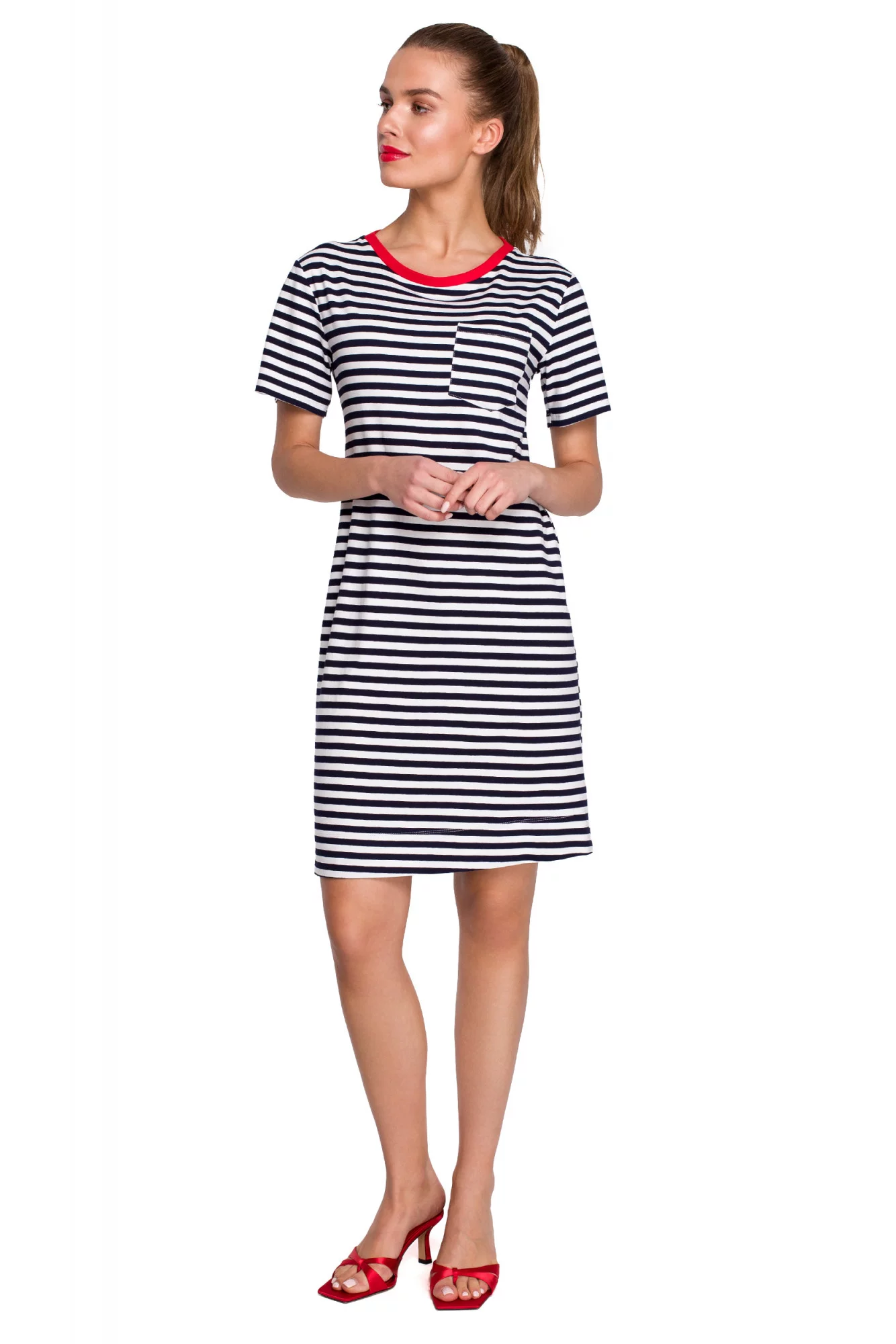 Zvolte sportovní eleganci a vyberte si jednoduché šaty v námořnických pruzích s kontrastním výstřihem a kapsami.