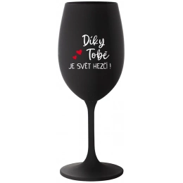 Vinná černá sklenice s originálním motivem DÍKY TOBĚ JE SVĚT HEZČÍ! je krásným a osobitým dárkem, které ale využijete i Vy sami třeba ve chvílích, kdy si budete chtít zpříjemnit náročný den. Tyto originální vinné sklenice jsou totiž nejen pro výjimečné události, ale i pro běžné večery, které si chcete zpříjemnit sklenkou dobrého vína. Jistě proto potěší každého milovníka vína, i toho, kdo si umí svůj život vychutnat plnými doušky.