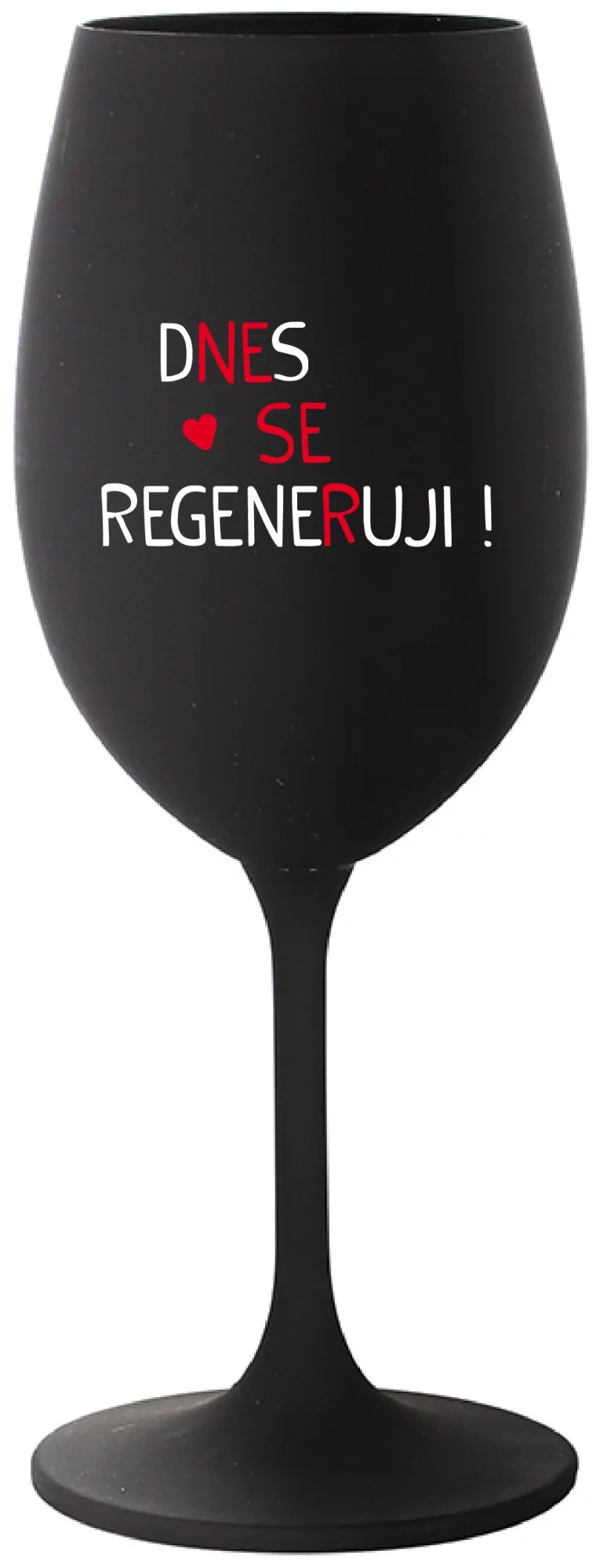 Vinná černá sklenice s originálním motivem DNES SE REGENERUJI! je krásným a osobitým dárkem, které ale využijete i Vy sami třeba ve chvílích, kdy si budete chtít zpříjemnit náročný den. Tyto originální vinné sklenice jsou totiž nejen pro výjimečné události, ale i pro běžné večery, které si chcete zpříjemnit sklenkou dobrého vína. Jistě proto potěší každého milovníka vína, i toho, kdo si umí svůj život vychutnat plnými doušky.