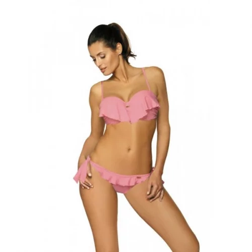 Podprsenka má střih typu bardotka. Vrchní část je ozdobená volánkem a ozdobnou mašličkou. Košíčky jsou vytvarované. Ramínka je možné nastavit i odepnout. Podprsenka se vzadu zapíná na pohodlný klip.