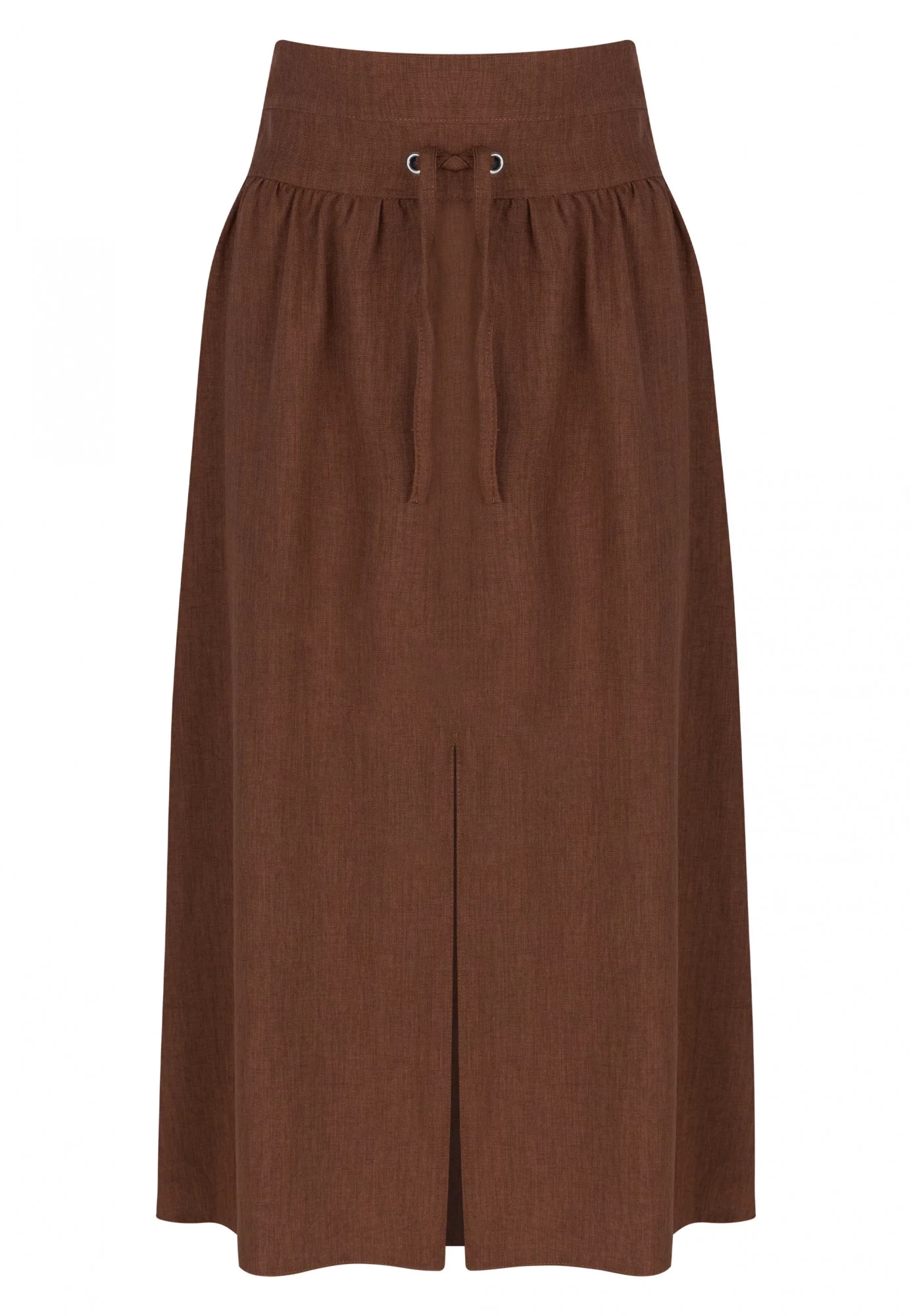 Hnědá dlouhá, rozšířená, nařasená sukně, široký vysoký pás s ozdobným zavazováním, vpředu rozparek, bez kapes, zapínání na levém boku na krytý zip, bez podšívky.